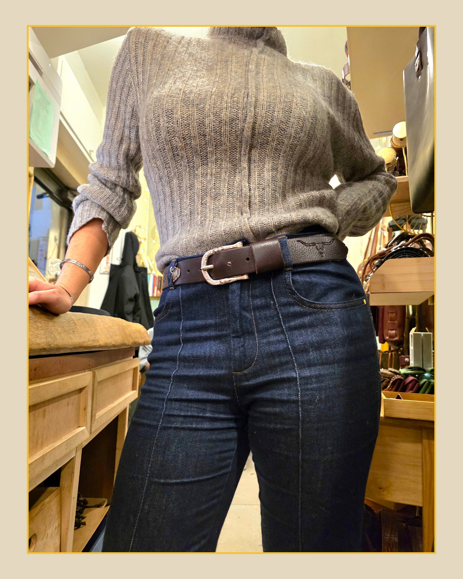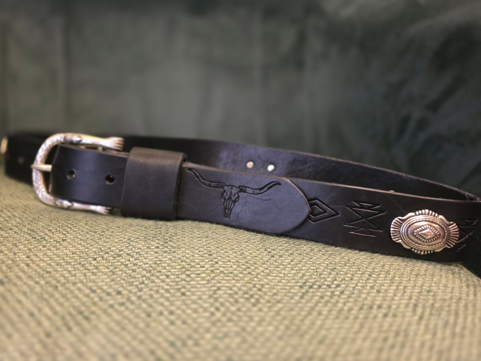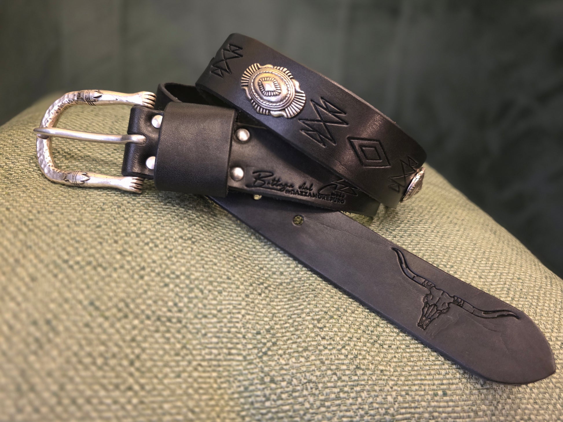 Bellissima cintura unisex in stile country d'ispirazione western alta 3,5cm circa con una particolarissima fibbia e concho ed incisioni su tutta la lunghezza.