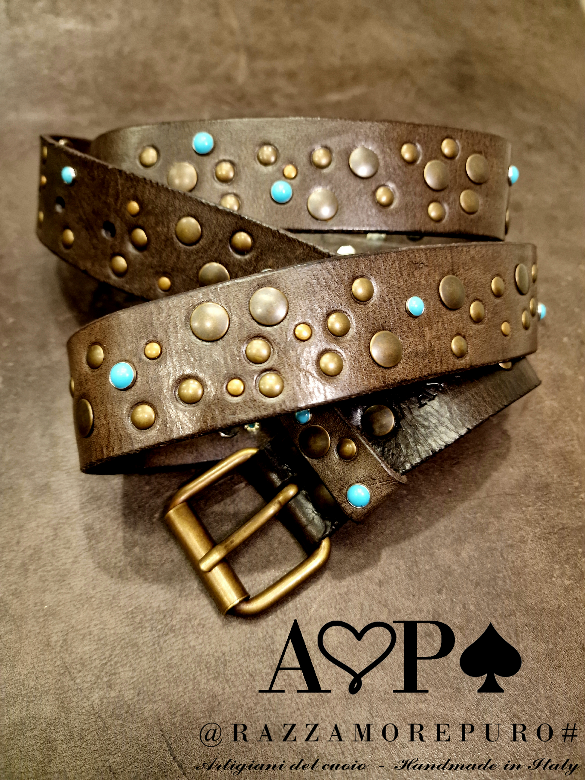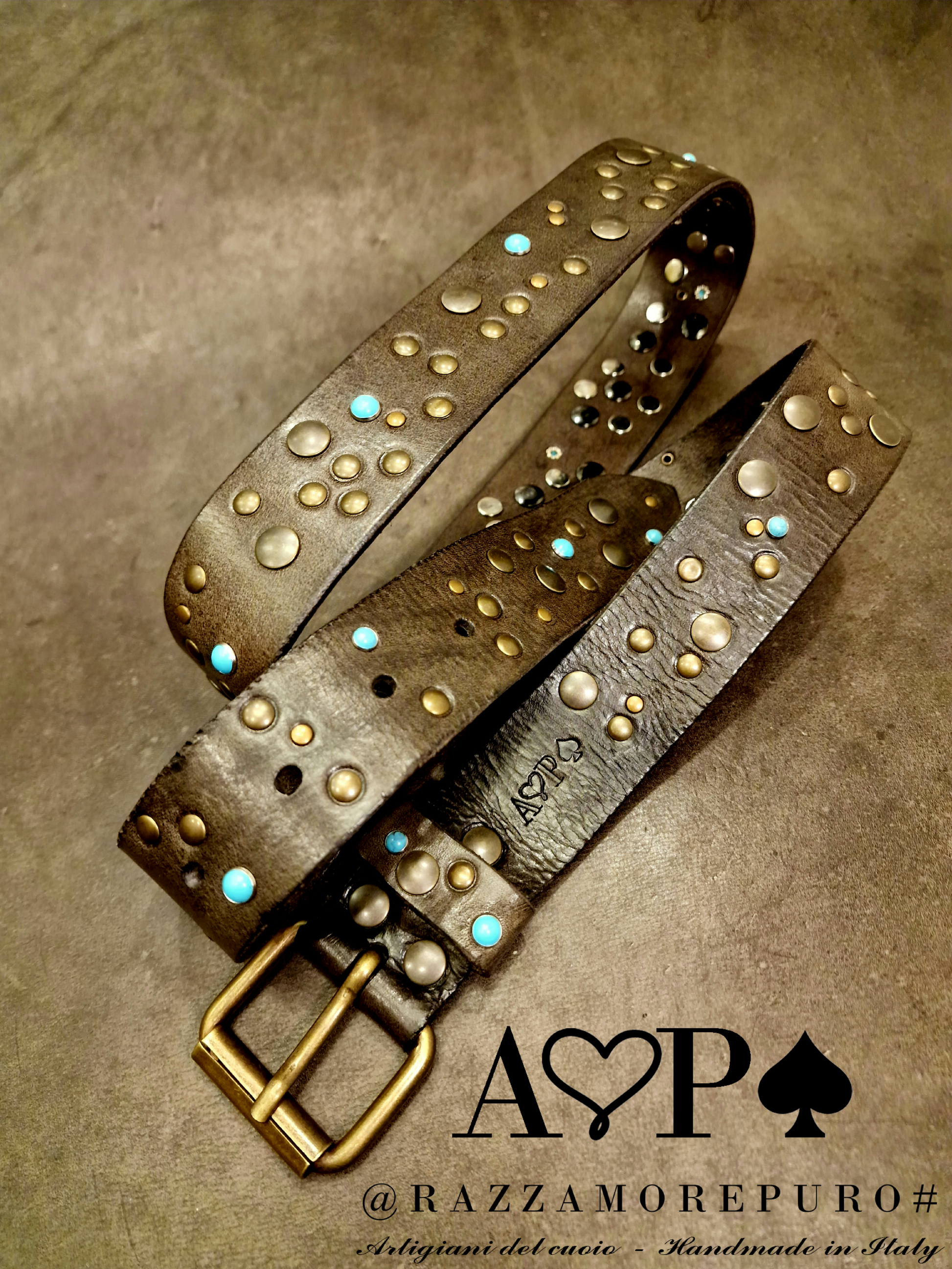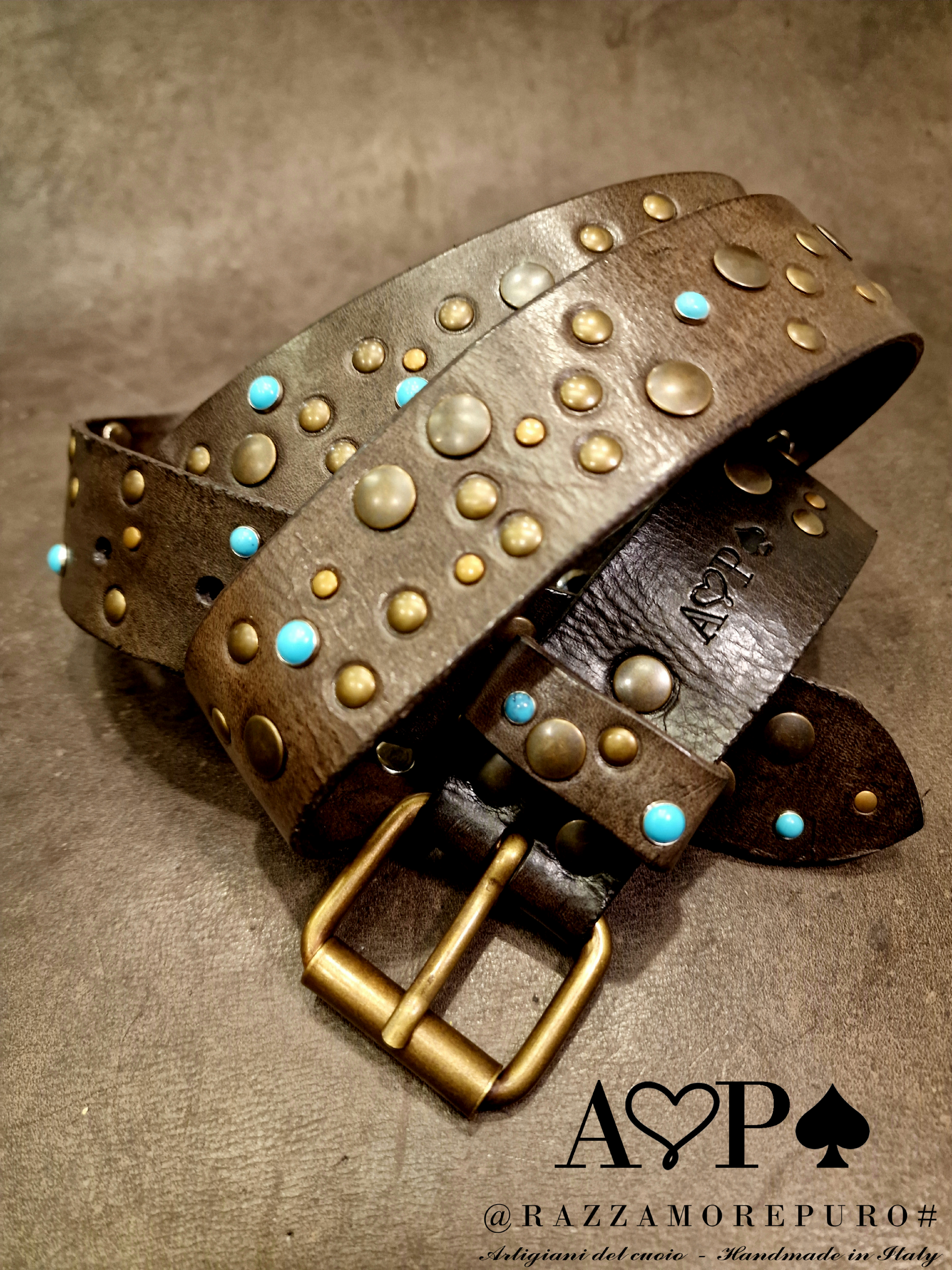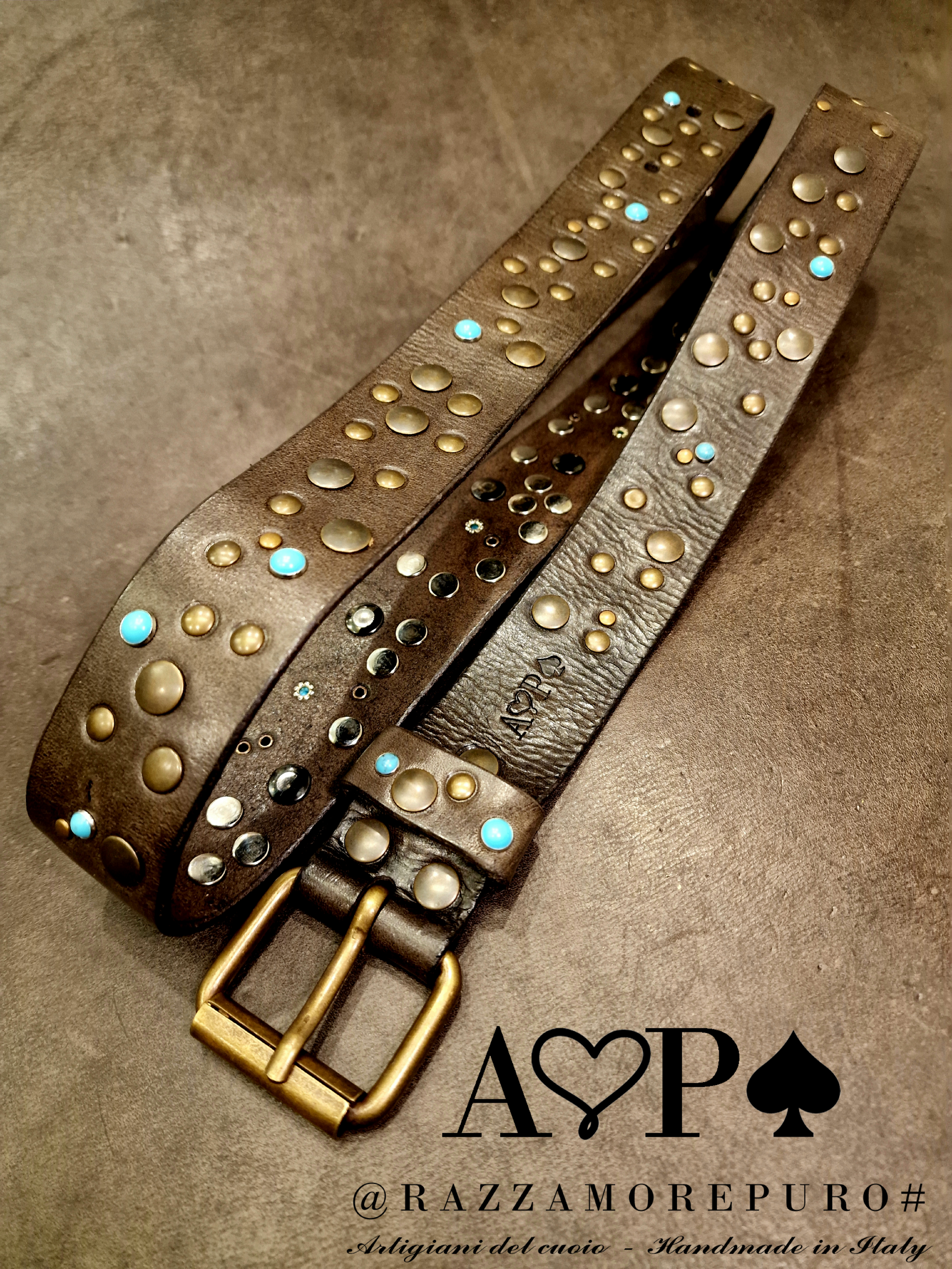 - belt with flat studs of mixed sizes and turquoise cabochons applied randomly