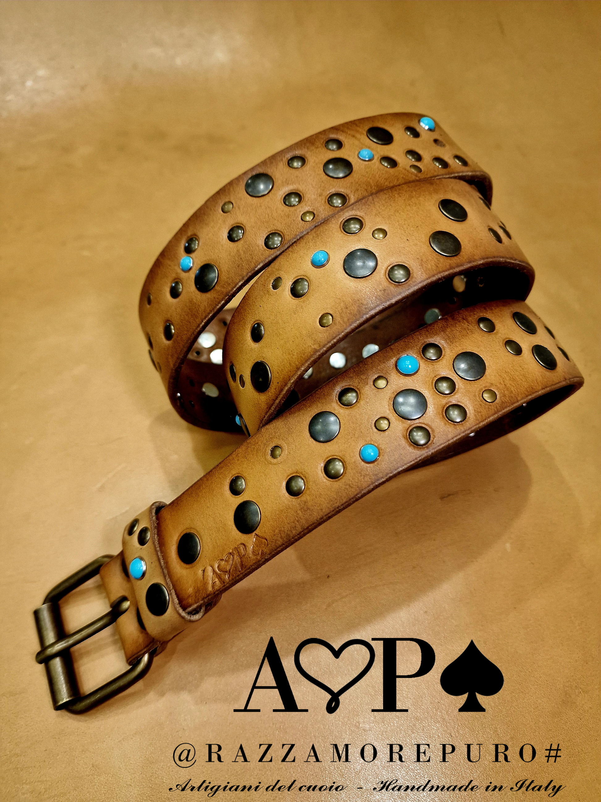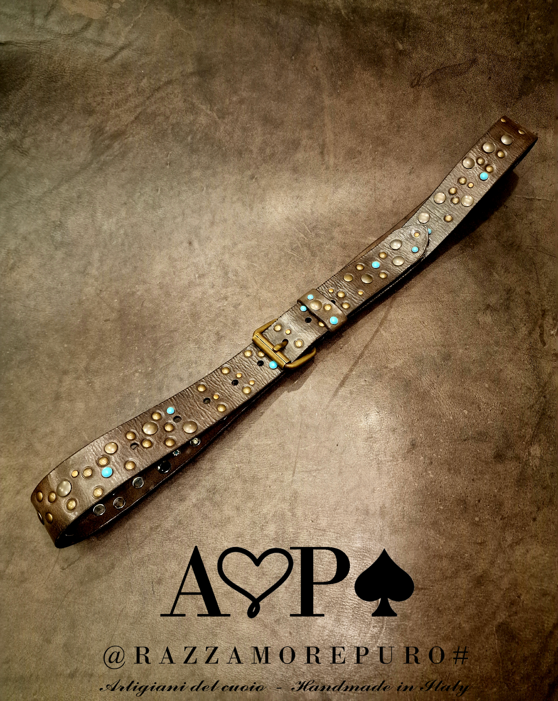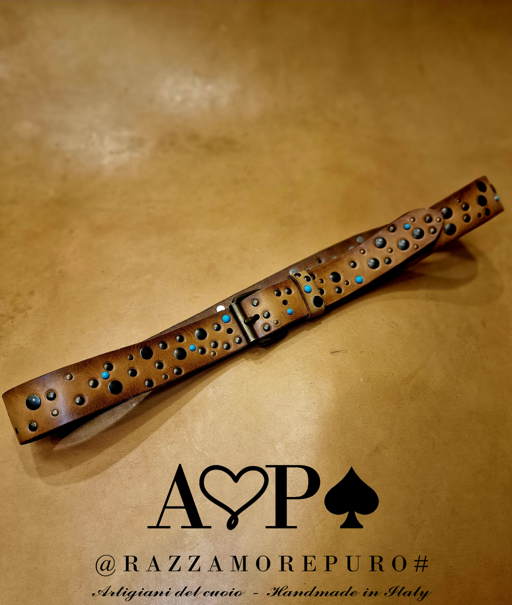 - belt with flat studs of mixed sizes and turquoise cabochons applied randomly
