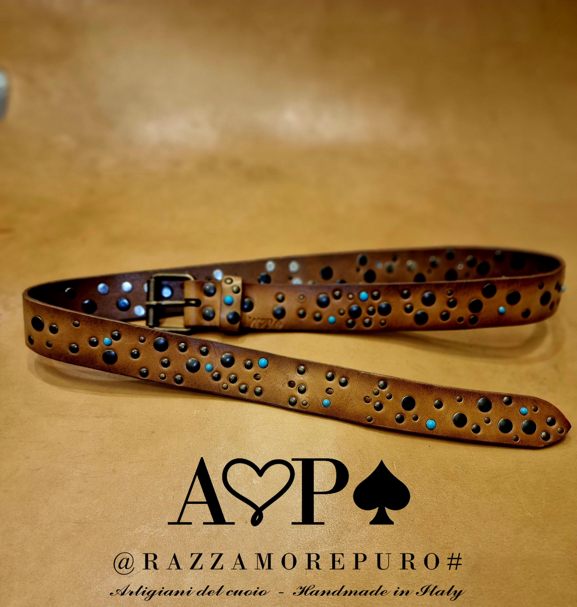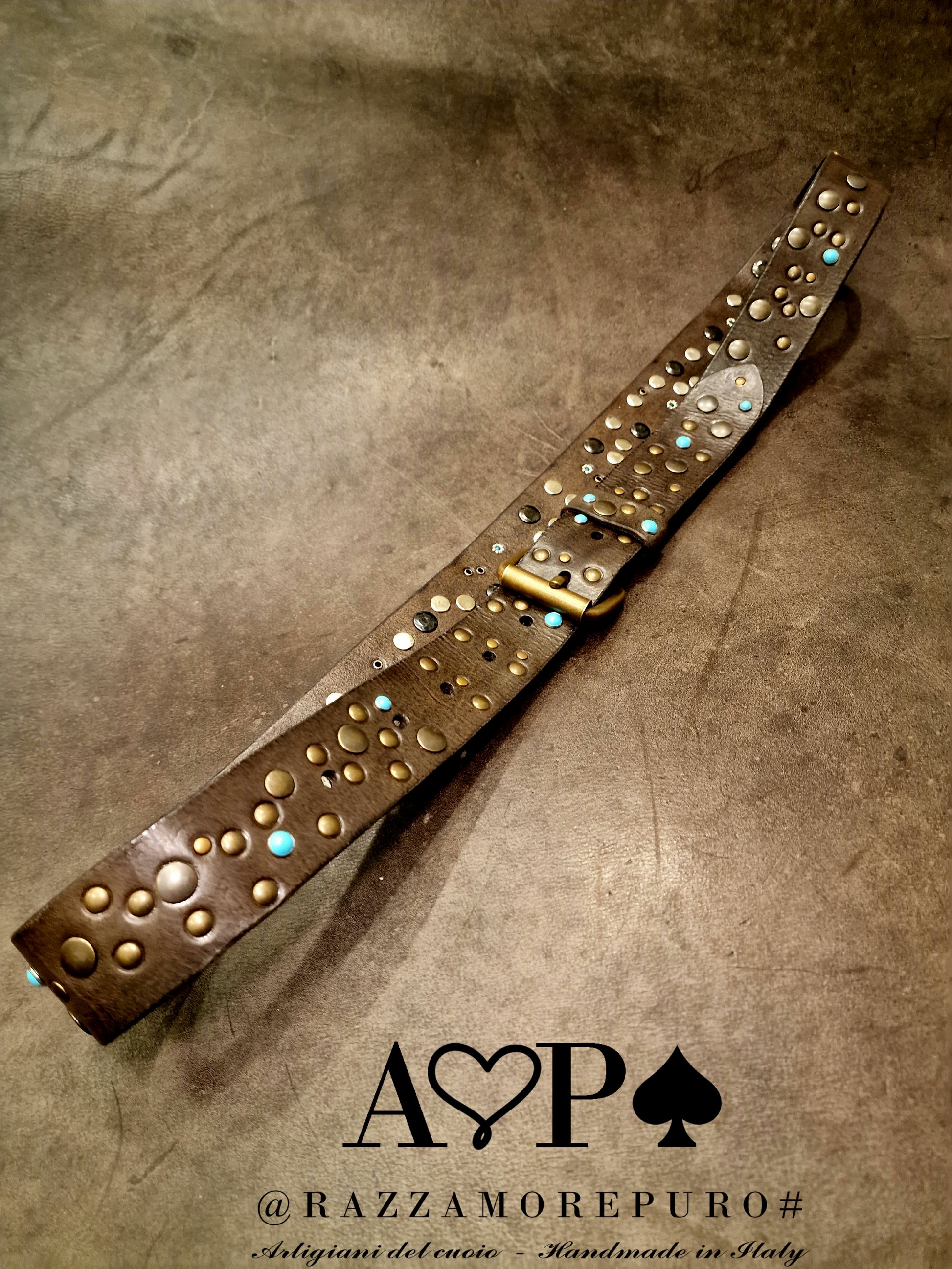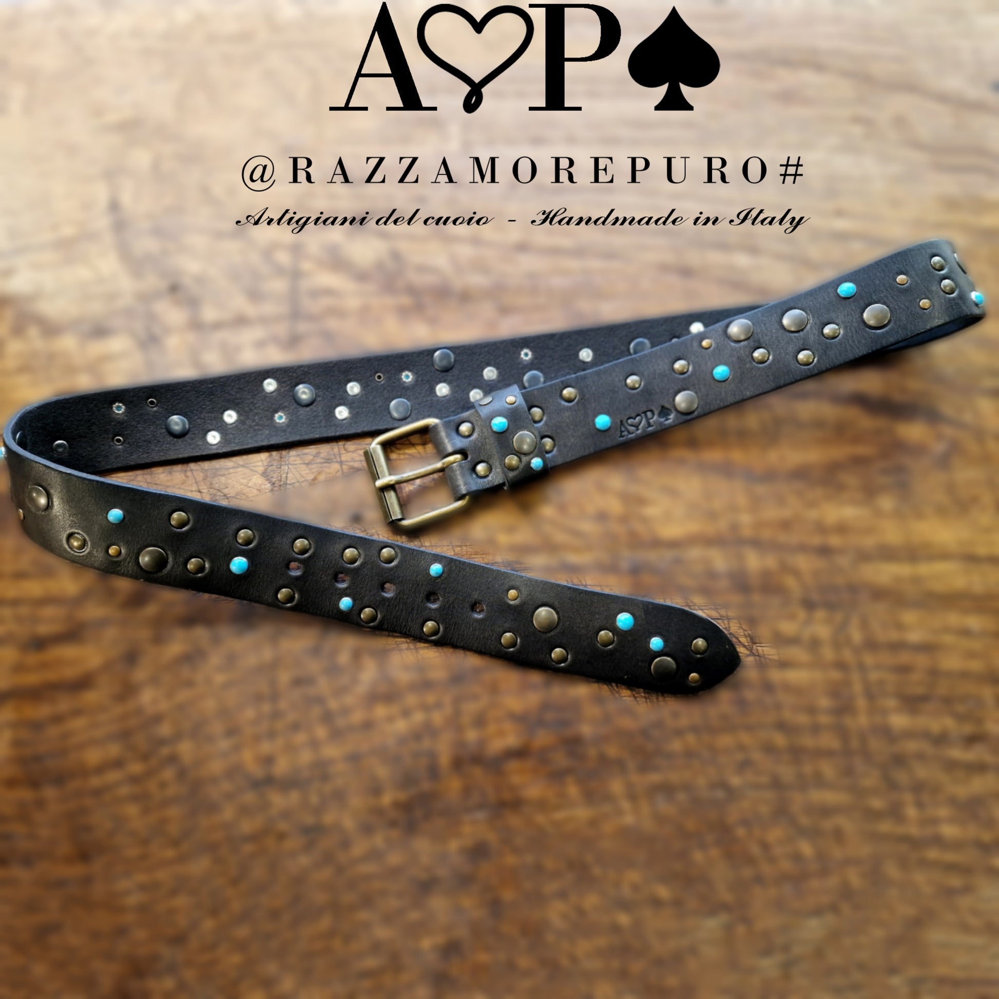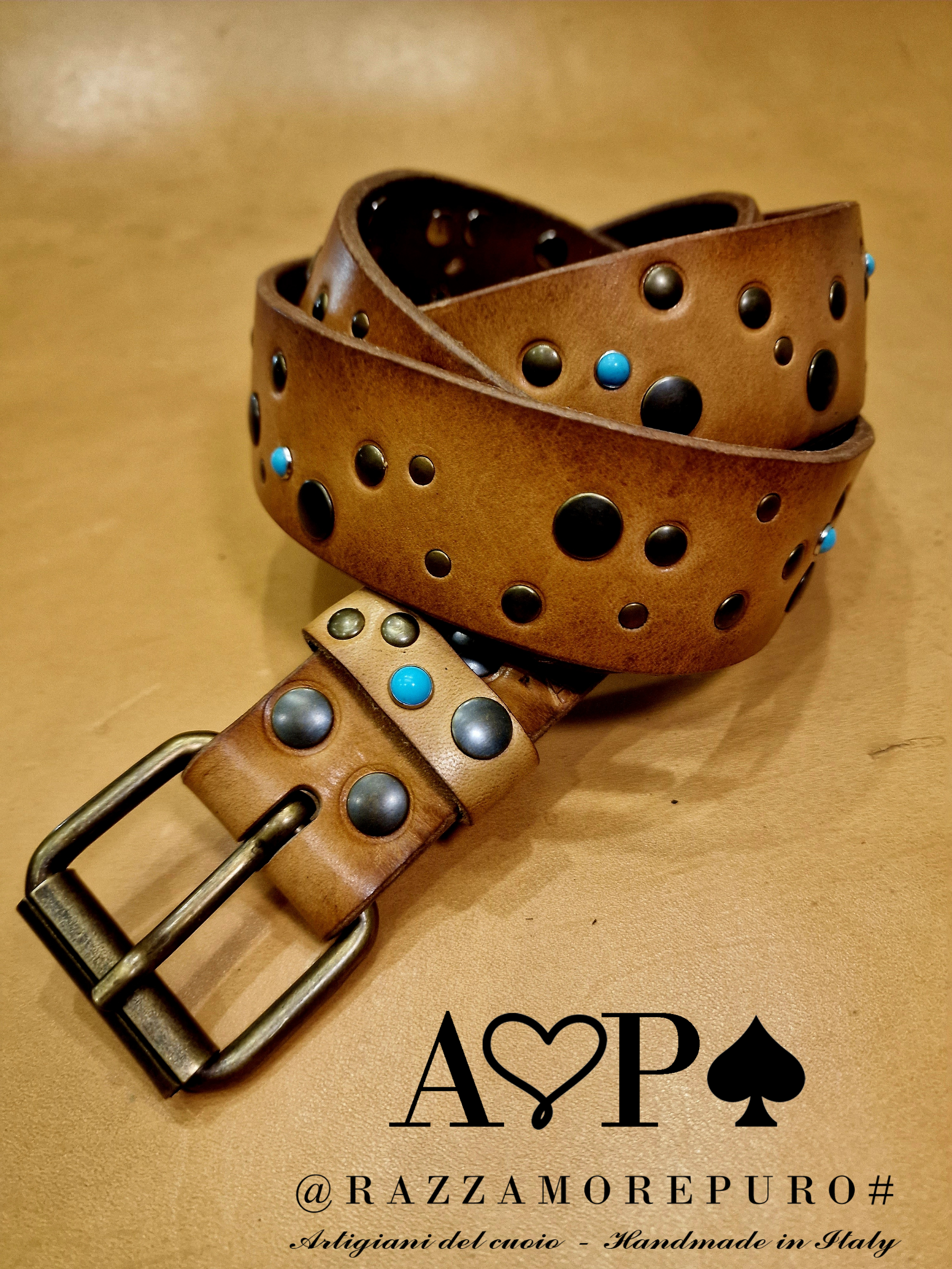 - belt with flat studs of mixed sizes and turquoise cabochons applied randomly