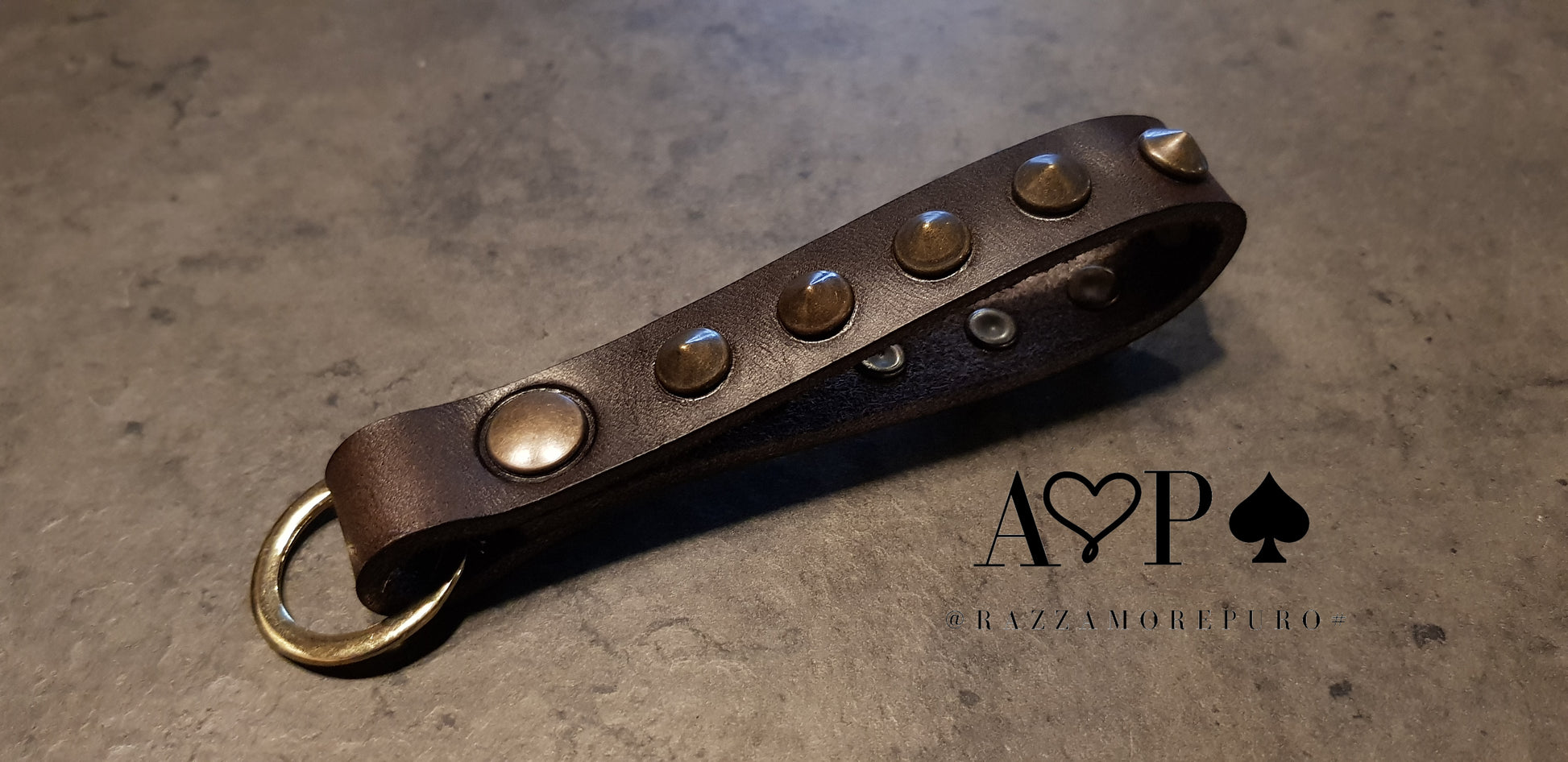Leather key ring with antique brass-coloured pointed studs