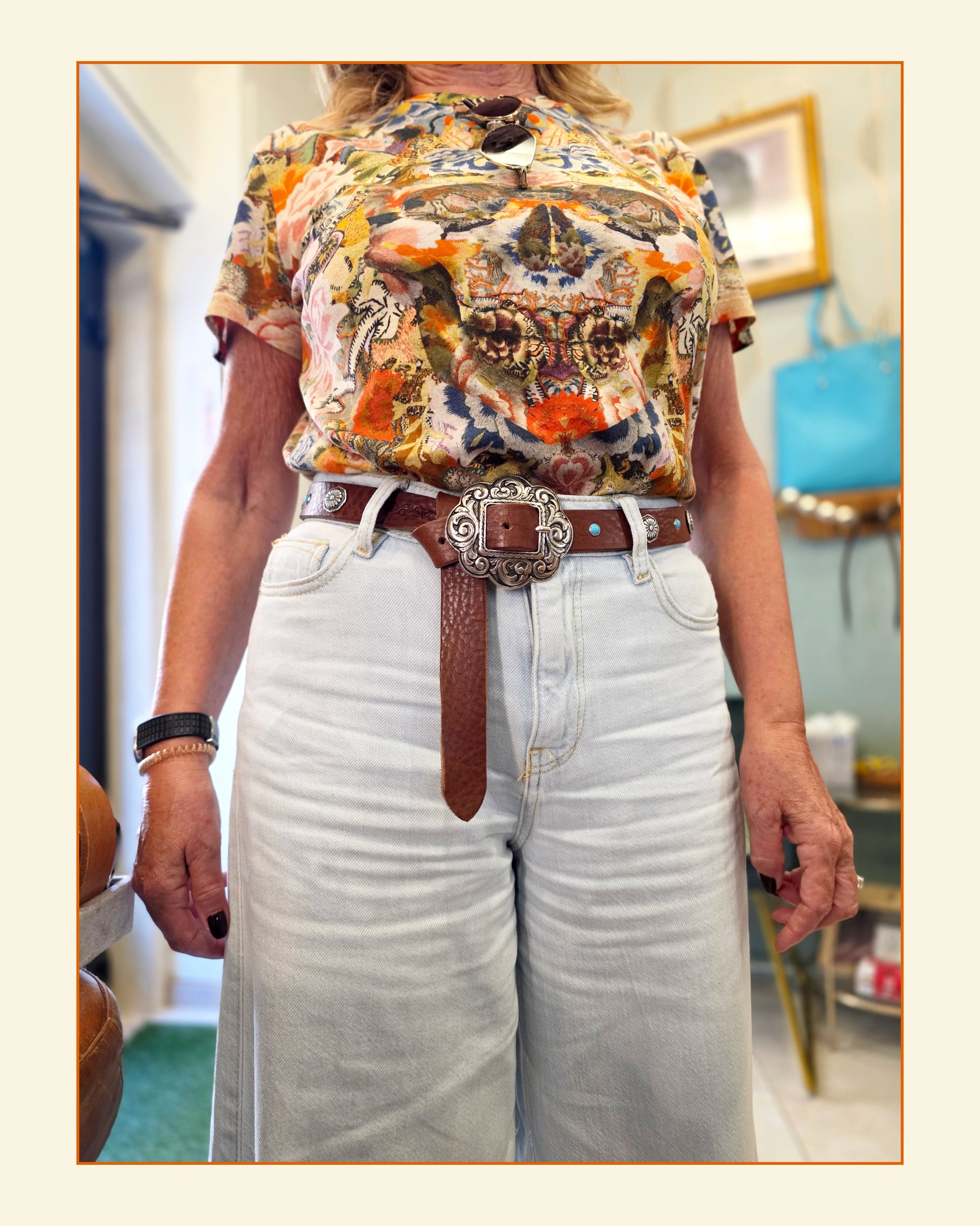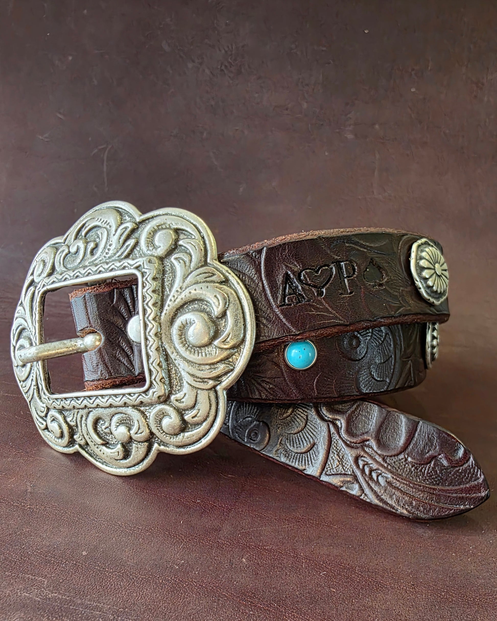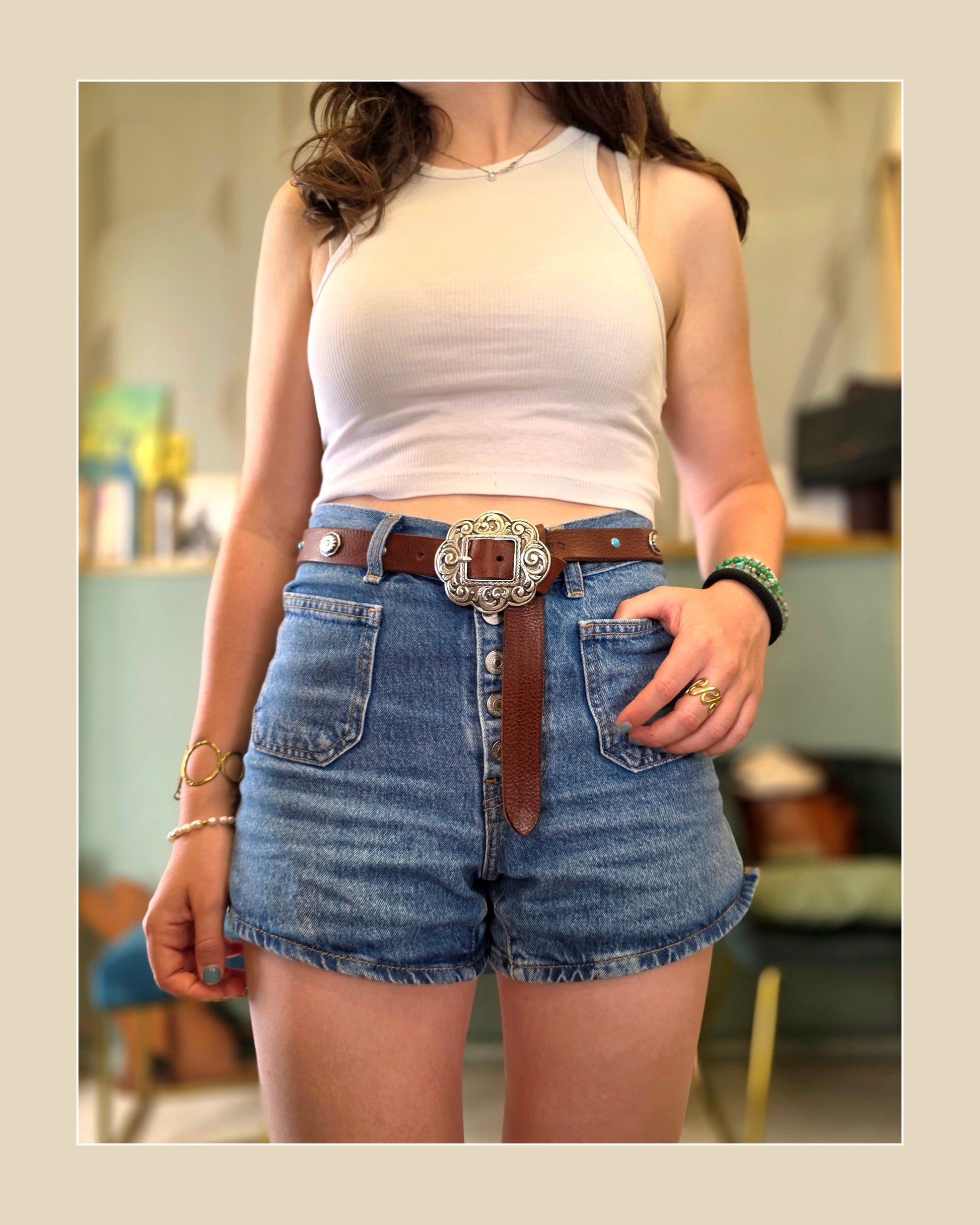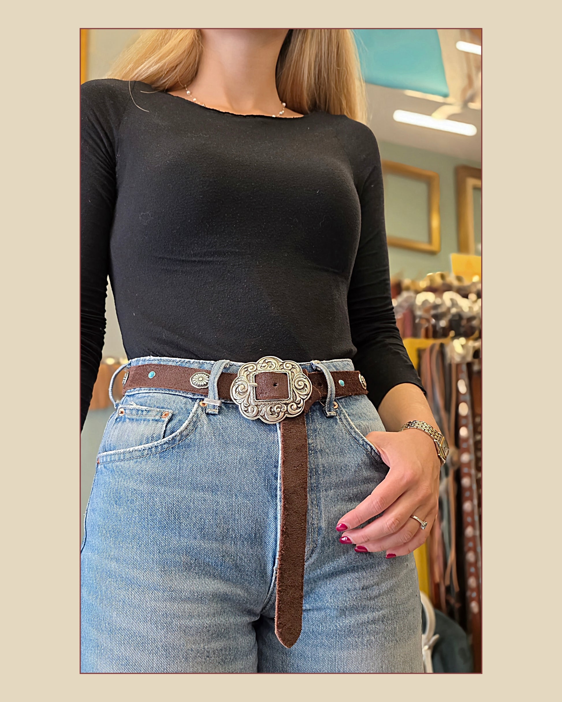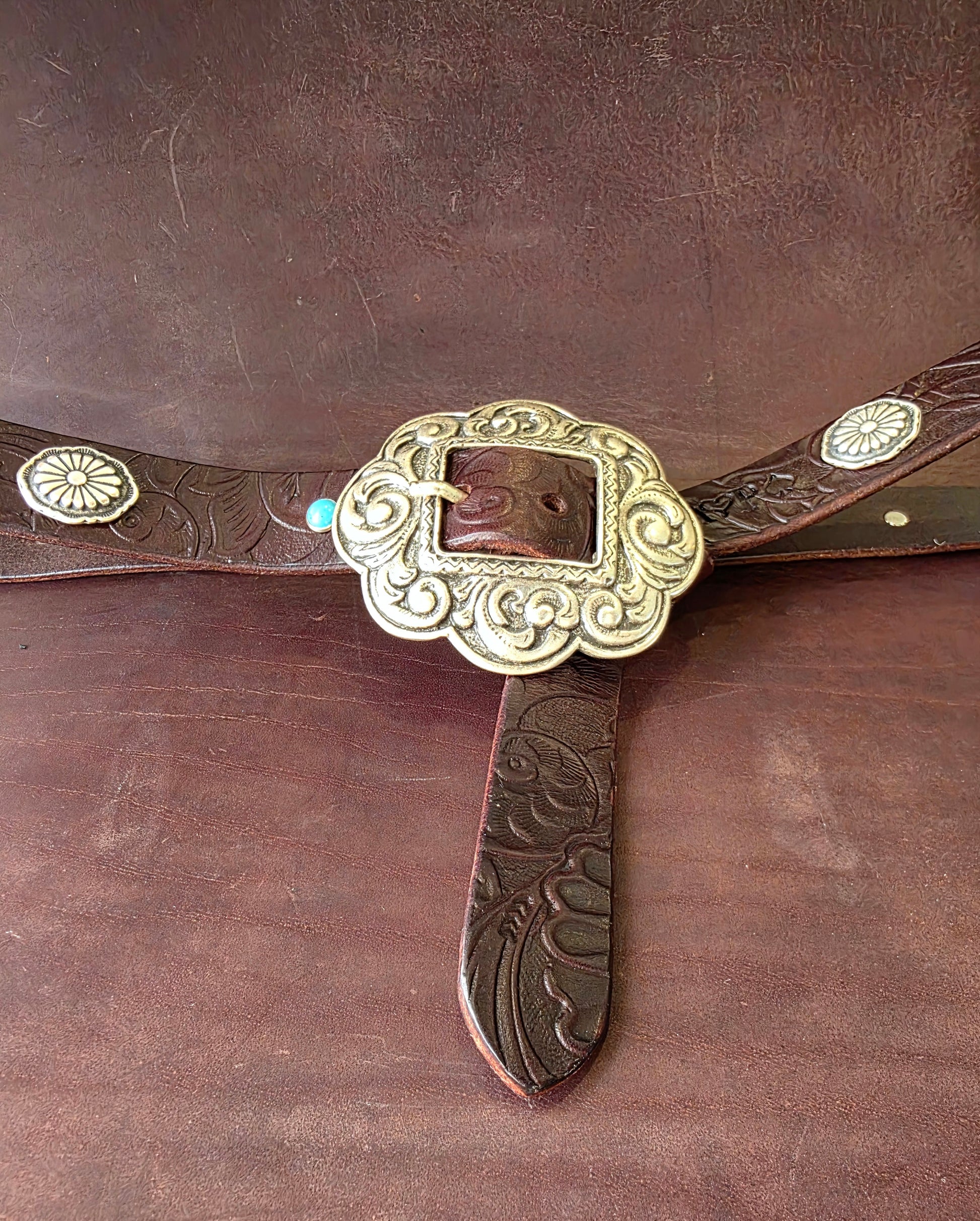 Meravigliosa cintura con fibbia concho in stile country alta 2,5cm circa con piccoli concho alternati a cabochon turchese.