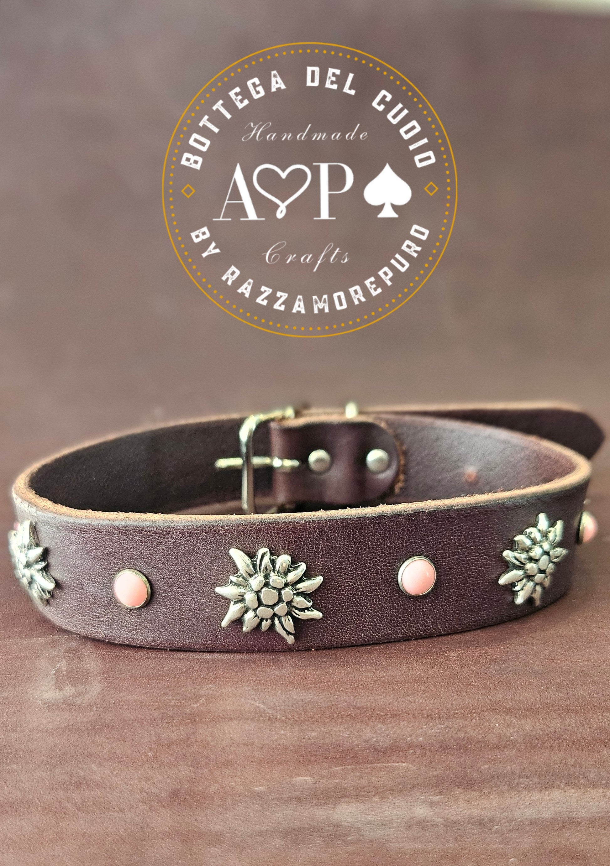 Collare in cuoio con bellissime stelle alpine e cabochon colorati alternati come da foto. Indica nelle note dell'ordine quelli che preferisci tra il verde, il turchese, il rosa e l'effetto perla.
