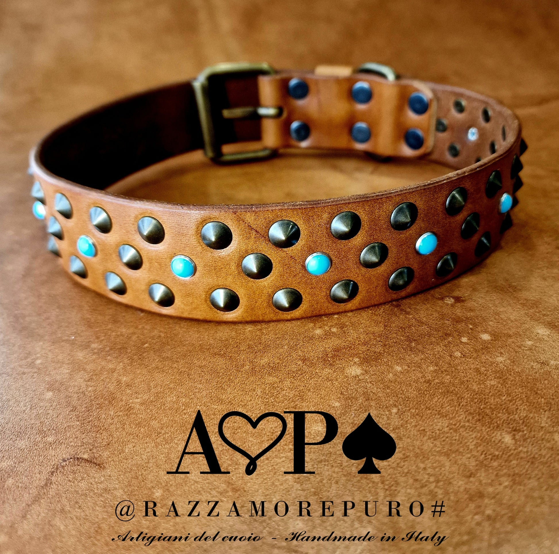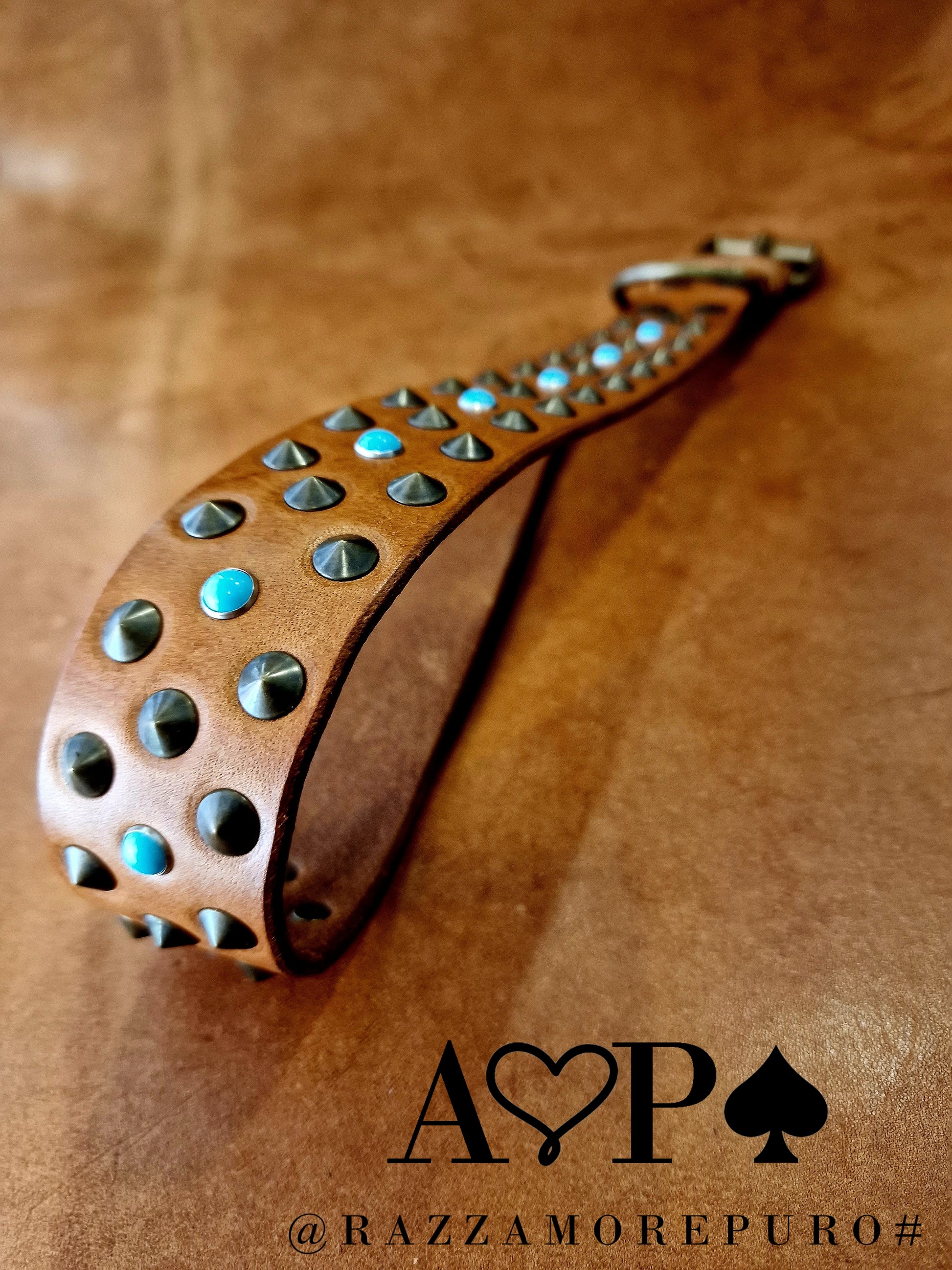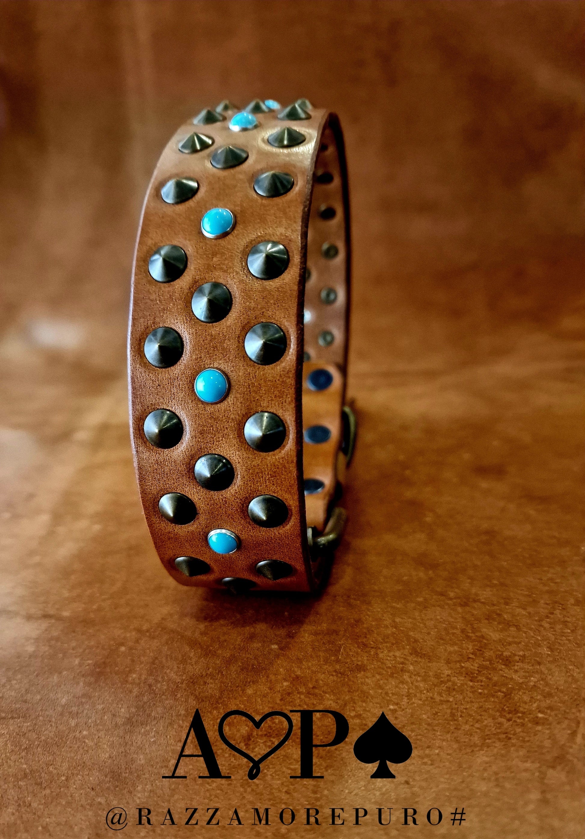 Collier en cuir avec 3 rangées de clous à pointe basse couleur laiton antique et cabochons bleu clair