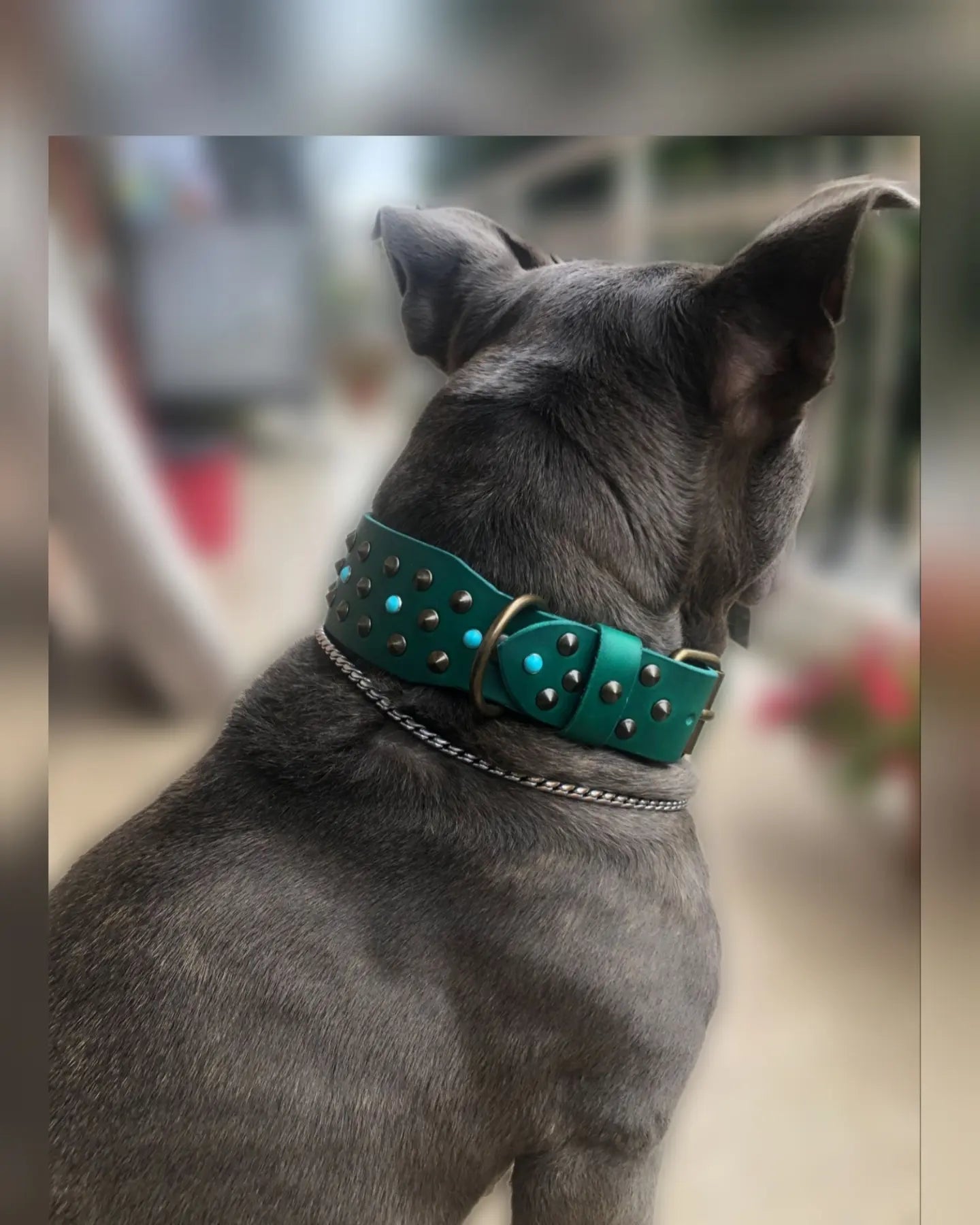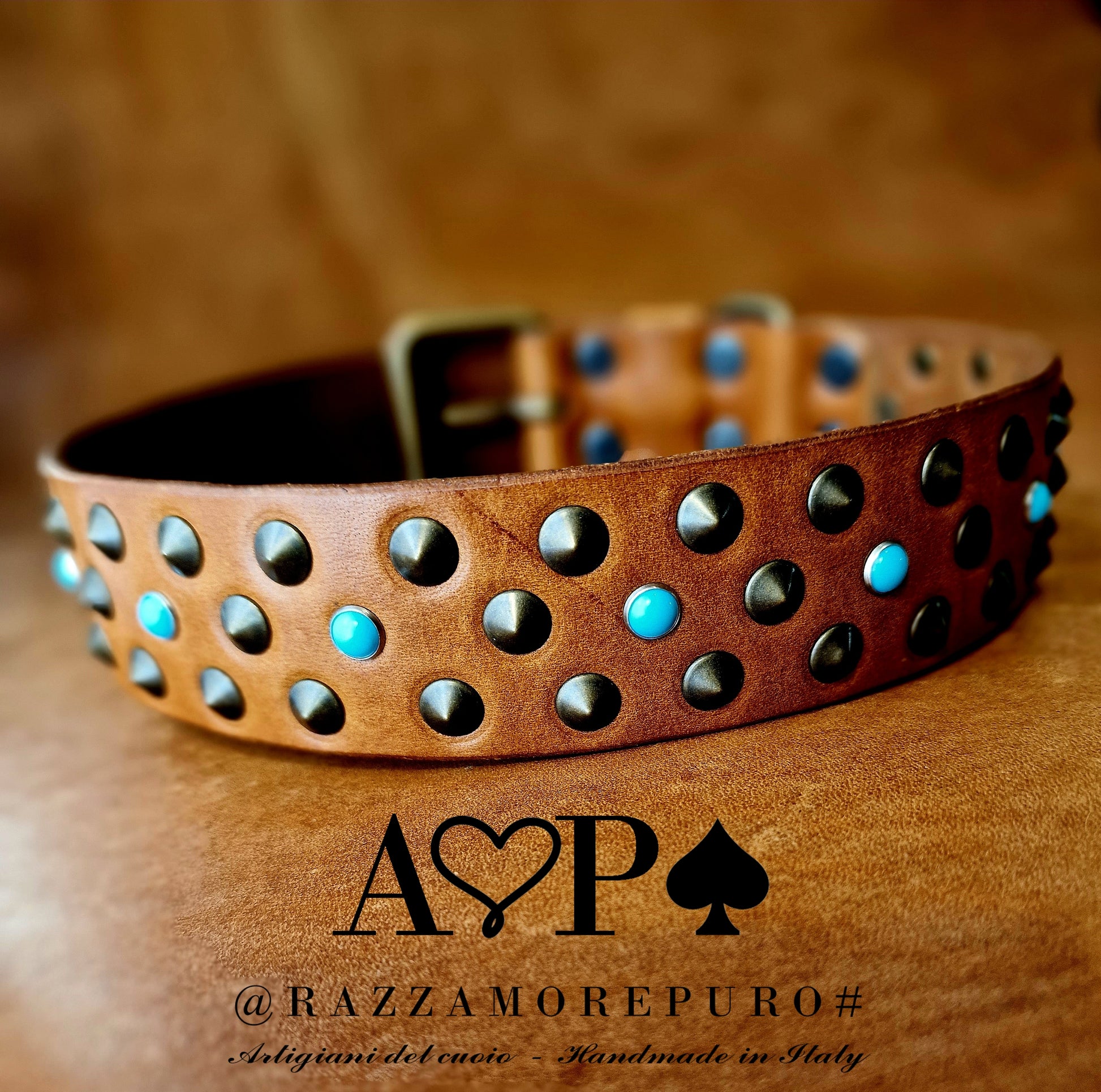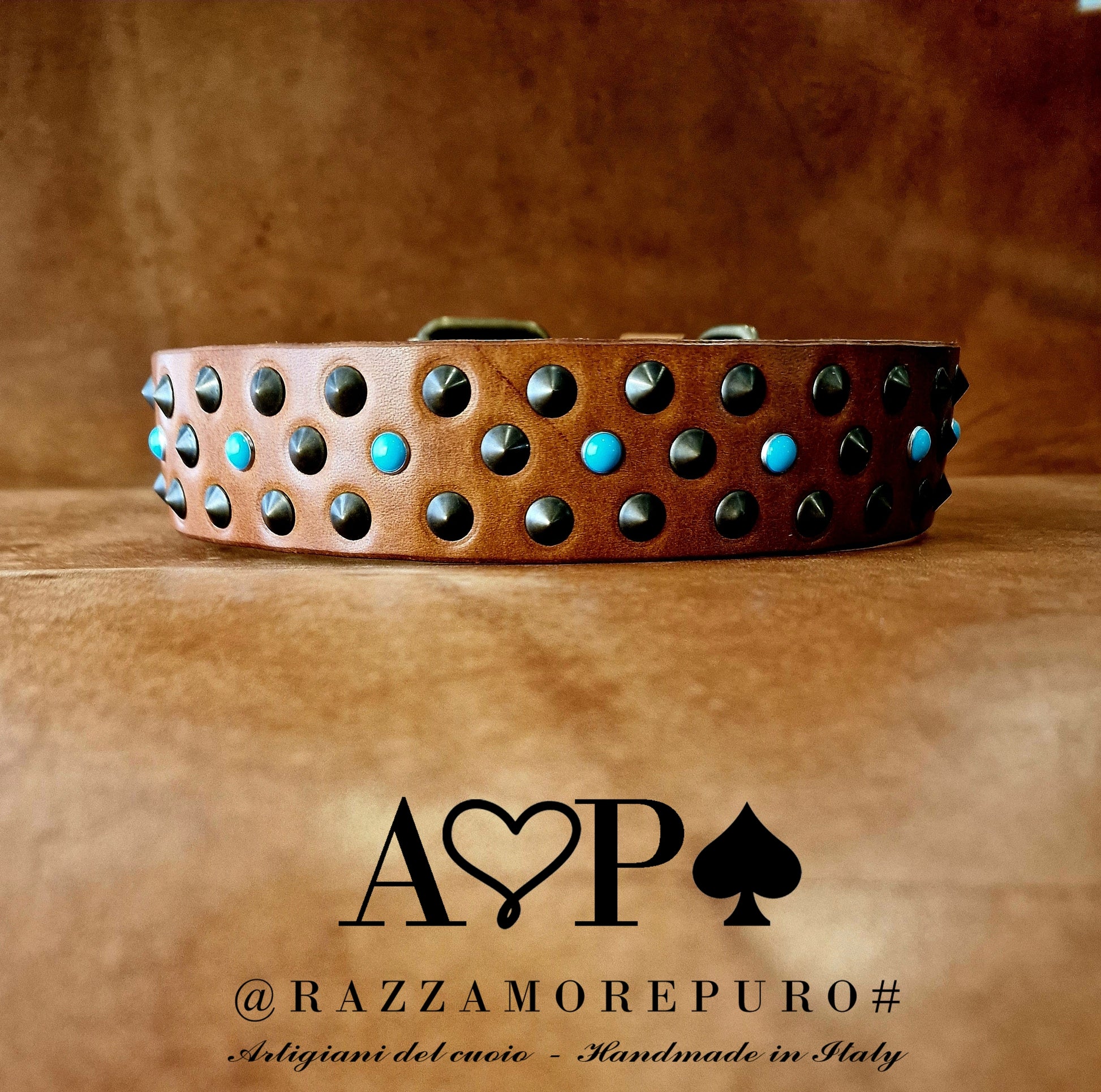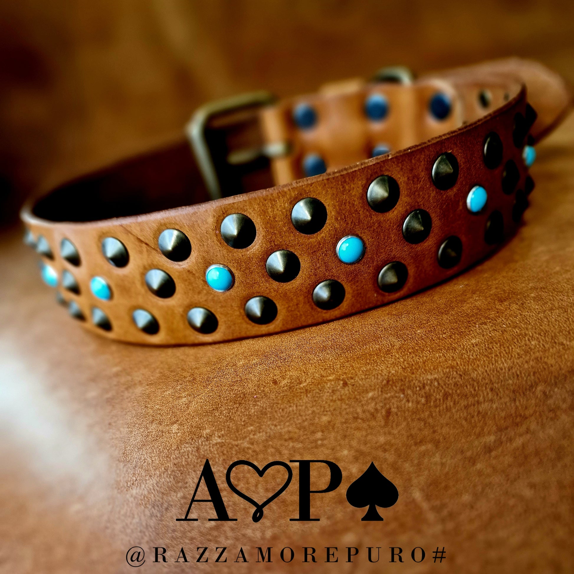 Collier en cuir avec 3 rangées de clous à pointe basse couleur laiton antique et cabochons bleu clair