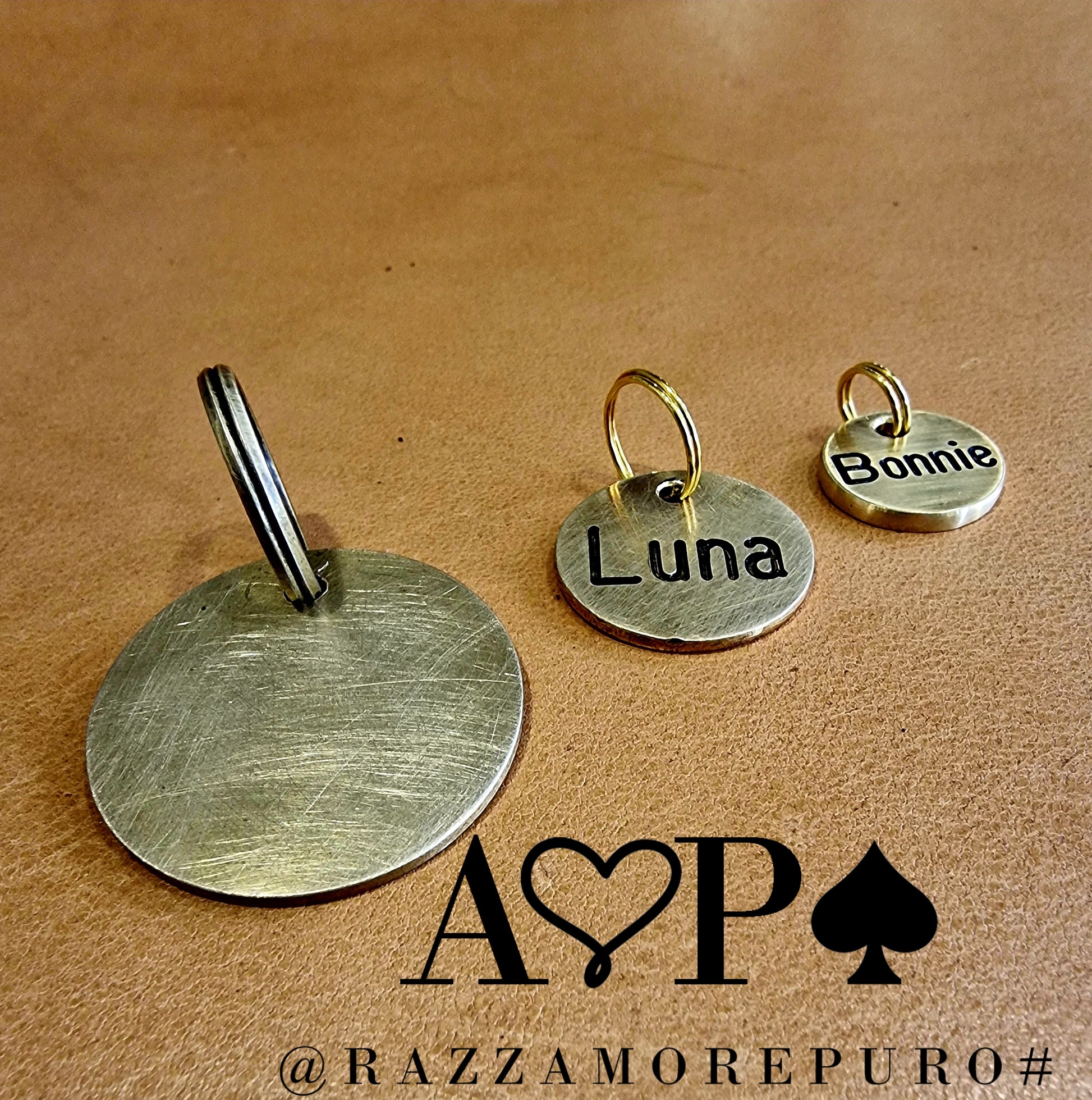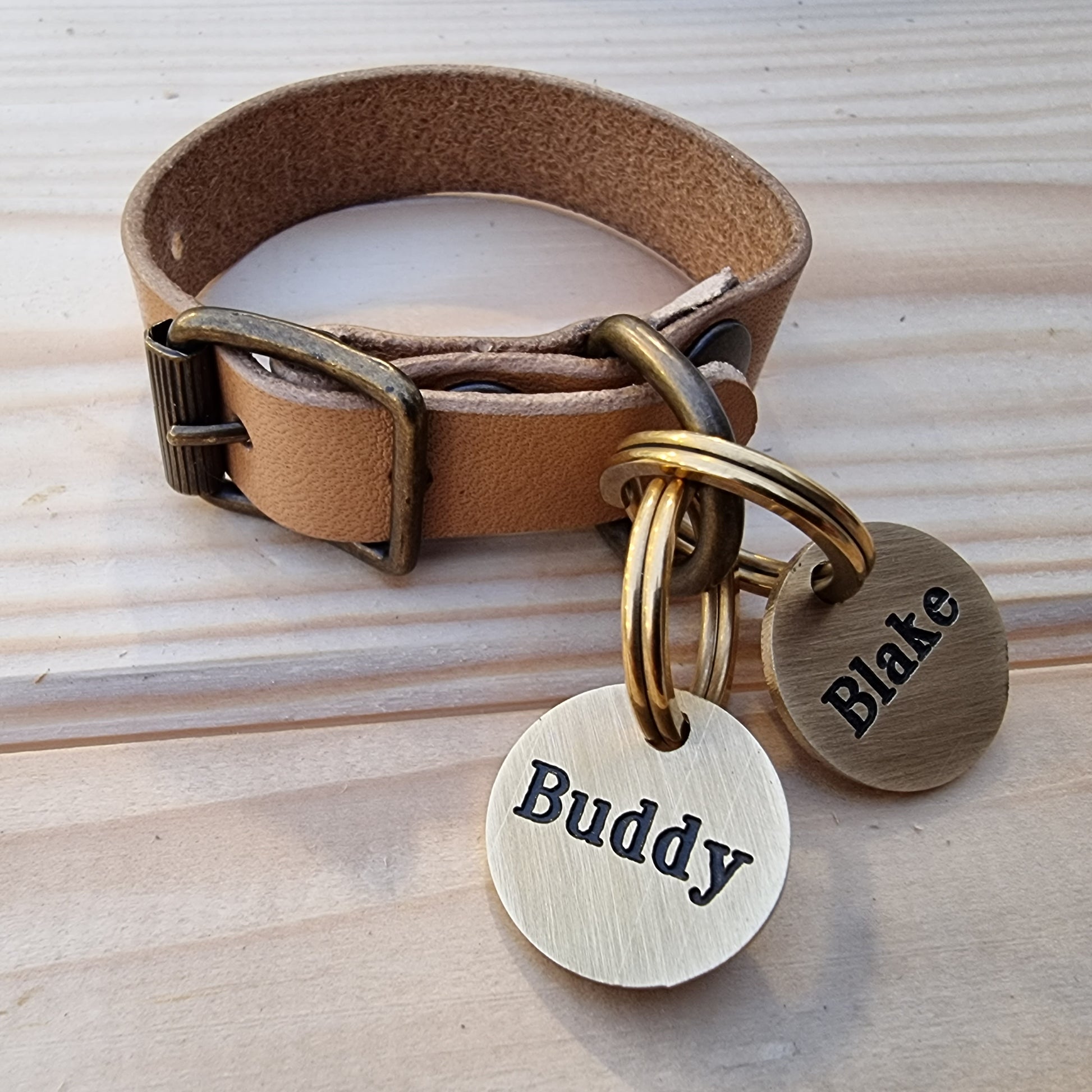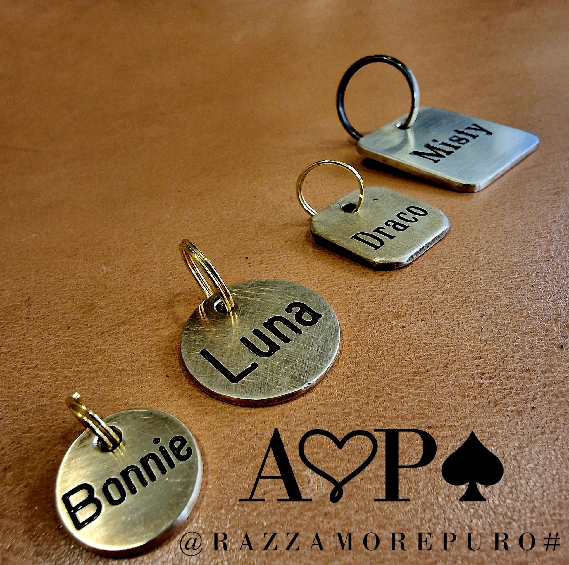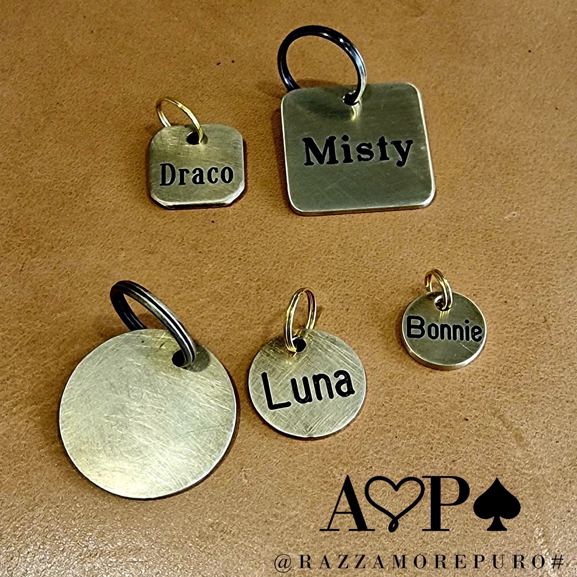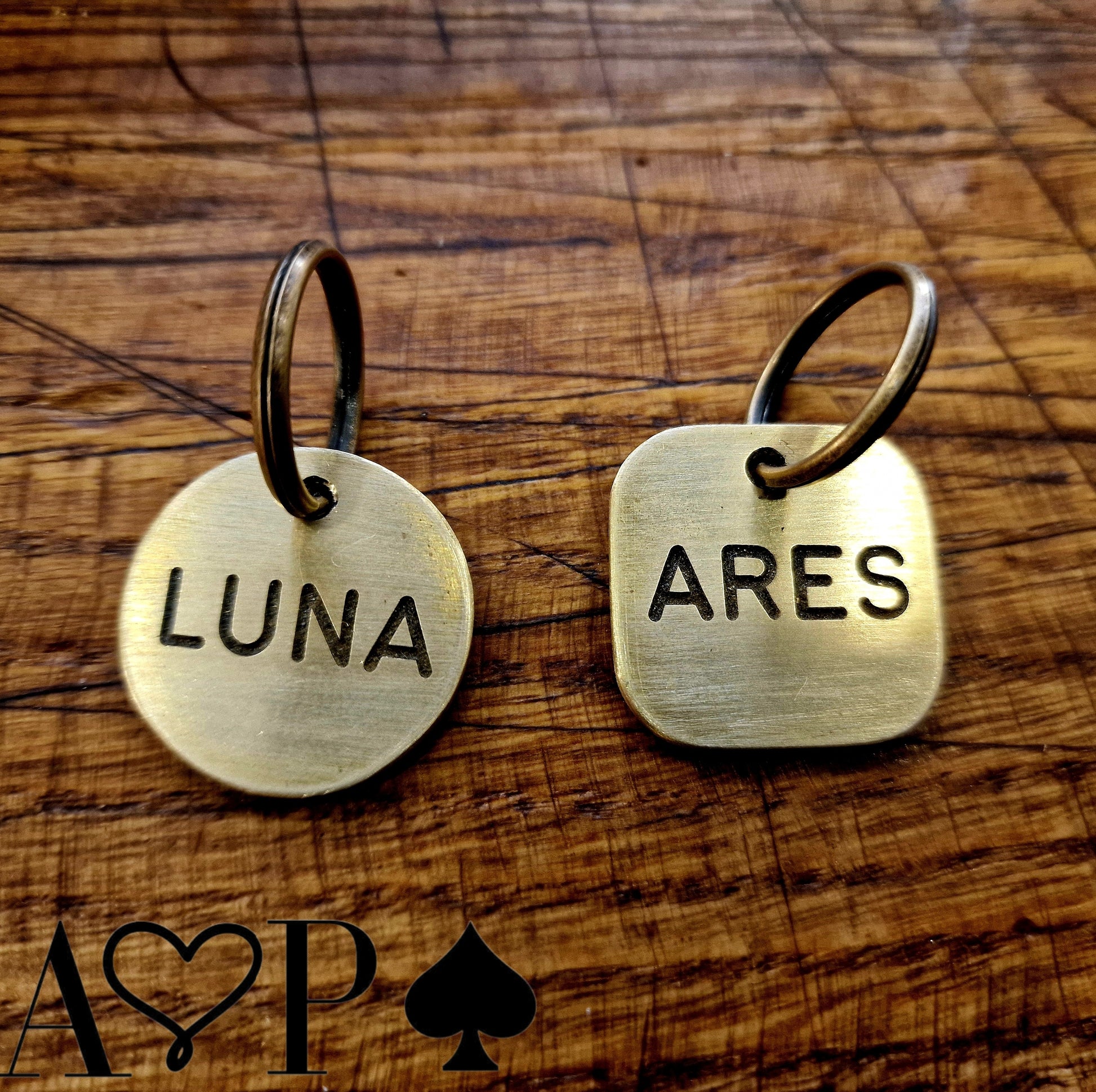 Étiquette d'identification en laiton véritable fabriquée à la main, comprenant un anneau en spirale pour l'attacher au collier.