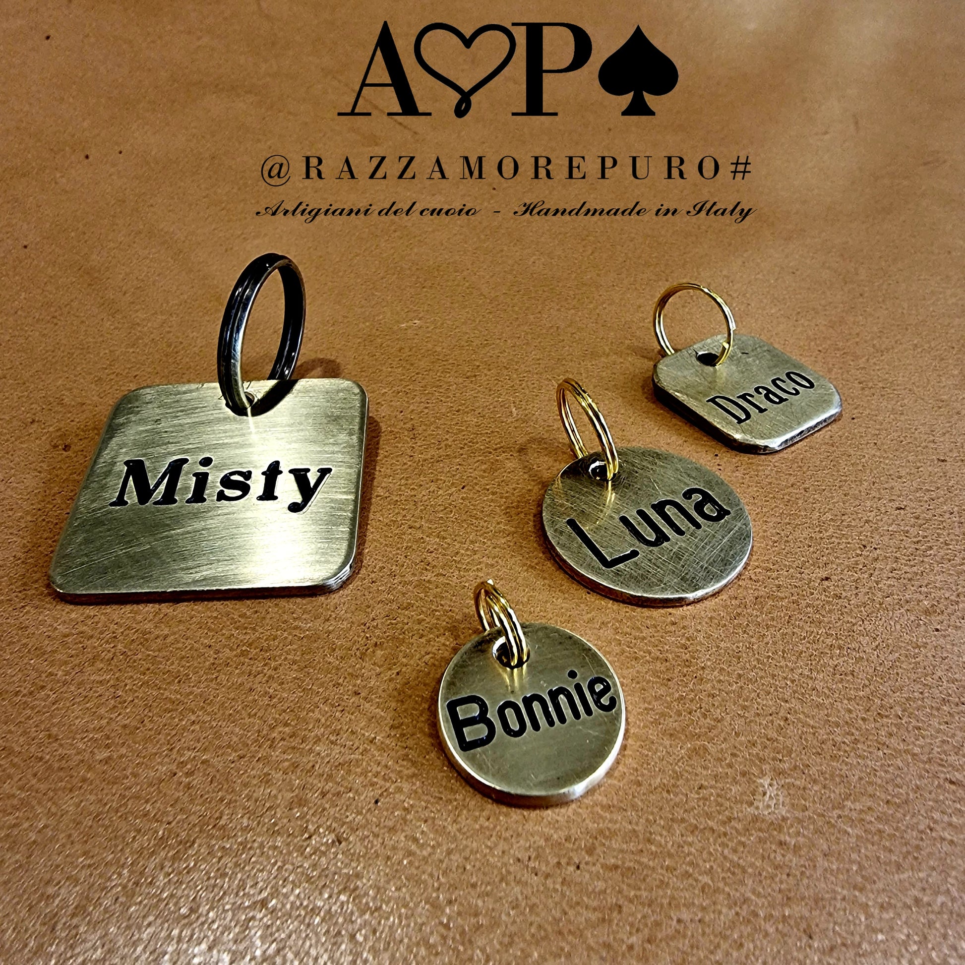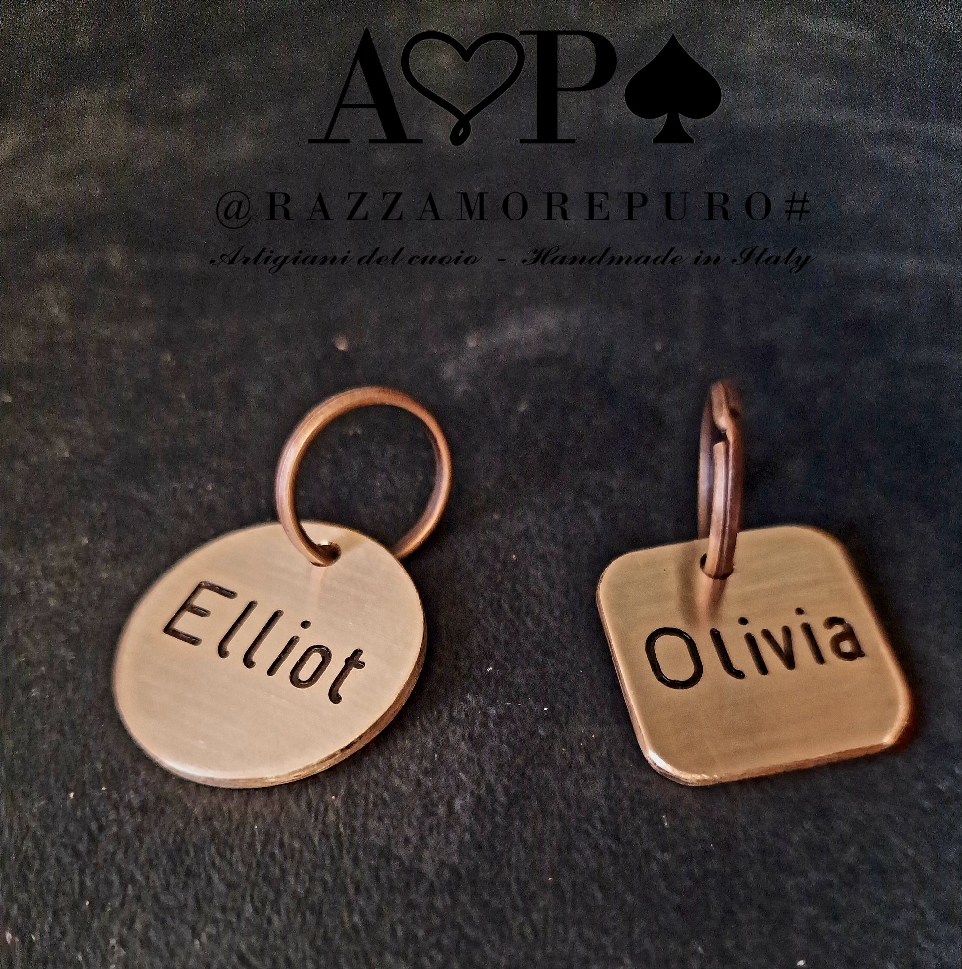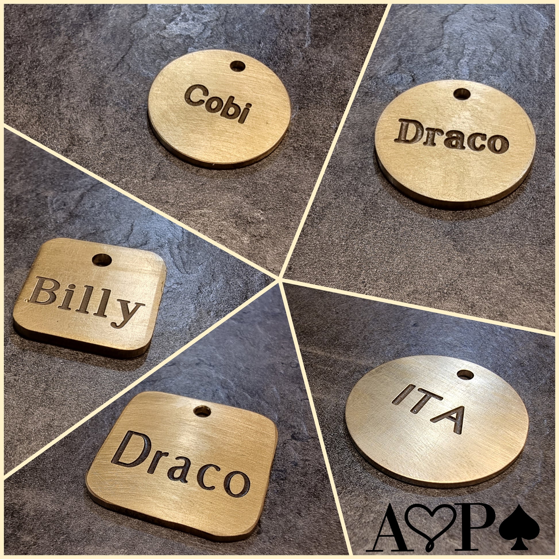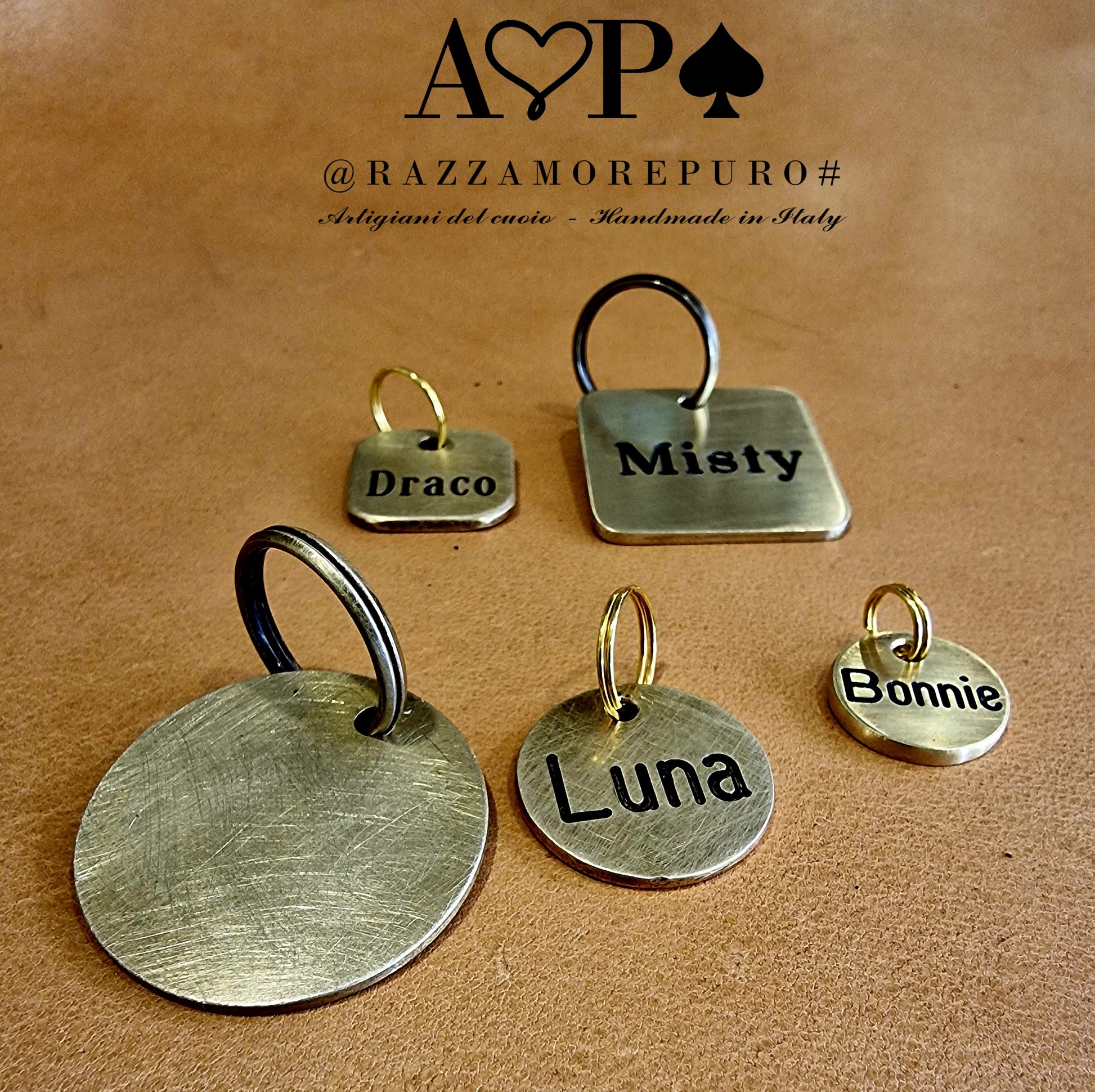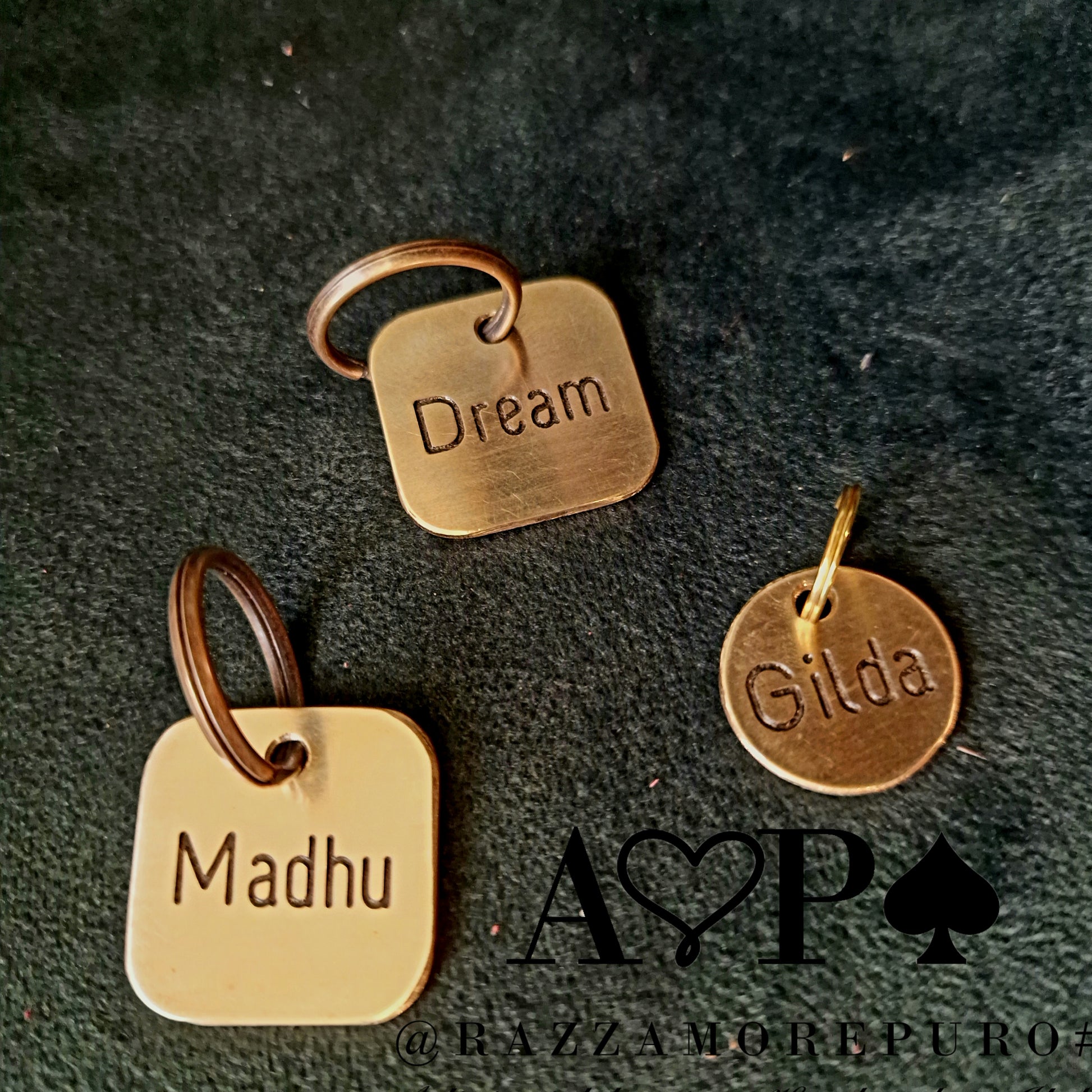 Étiquette d'identification en laiton véritable fabriquée à la main, comprenant un anneau en spirale pour l'attacher au collier.