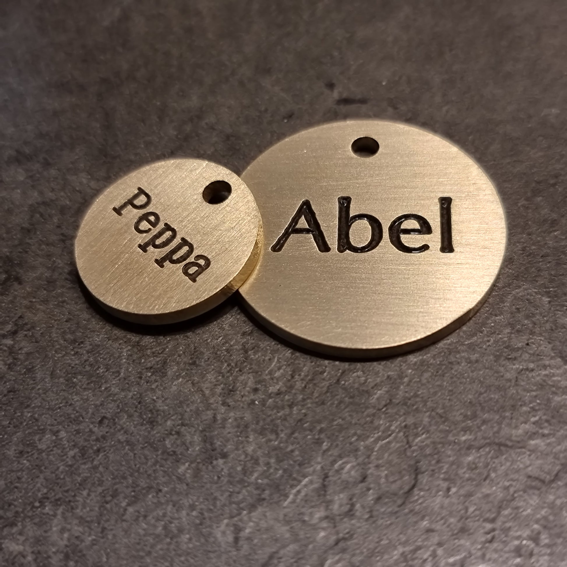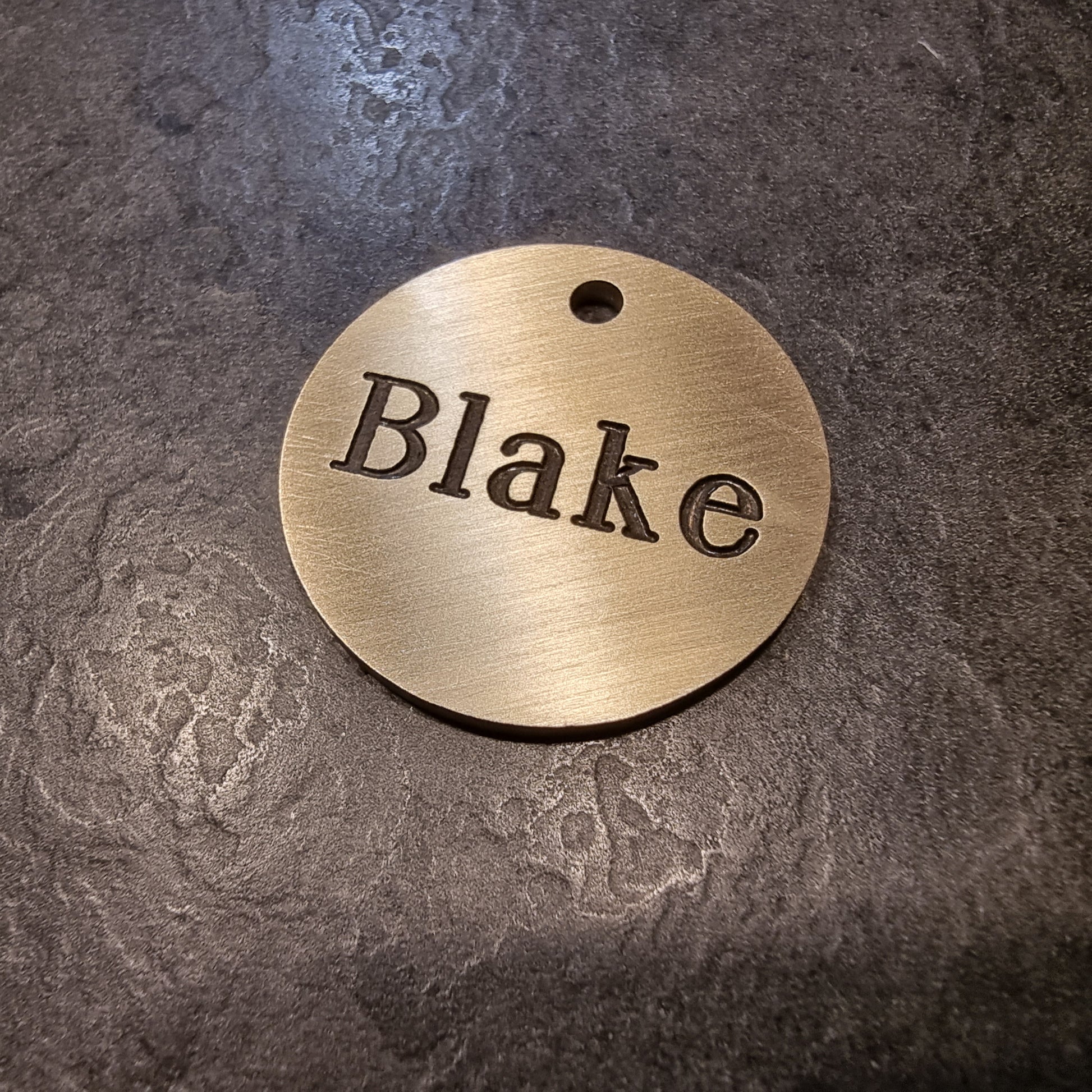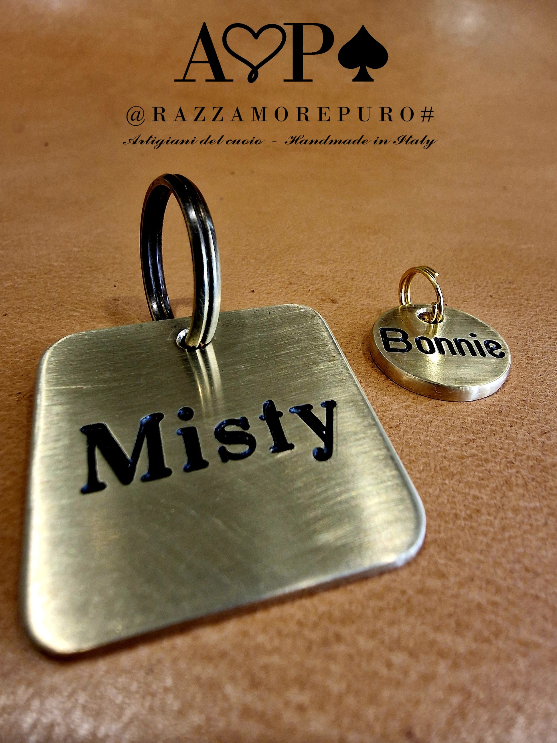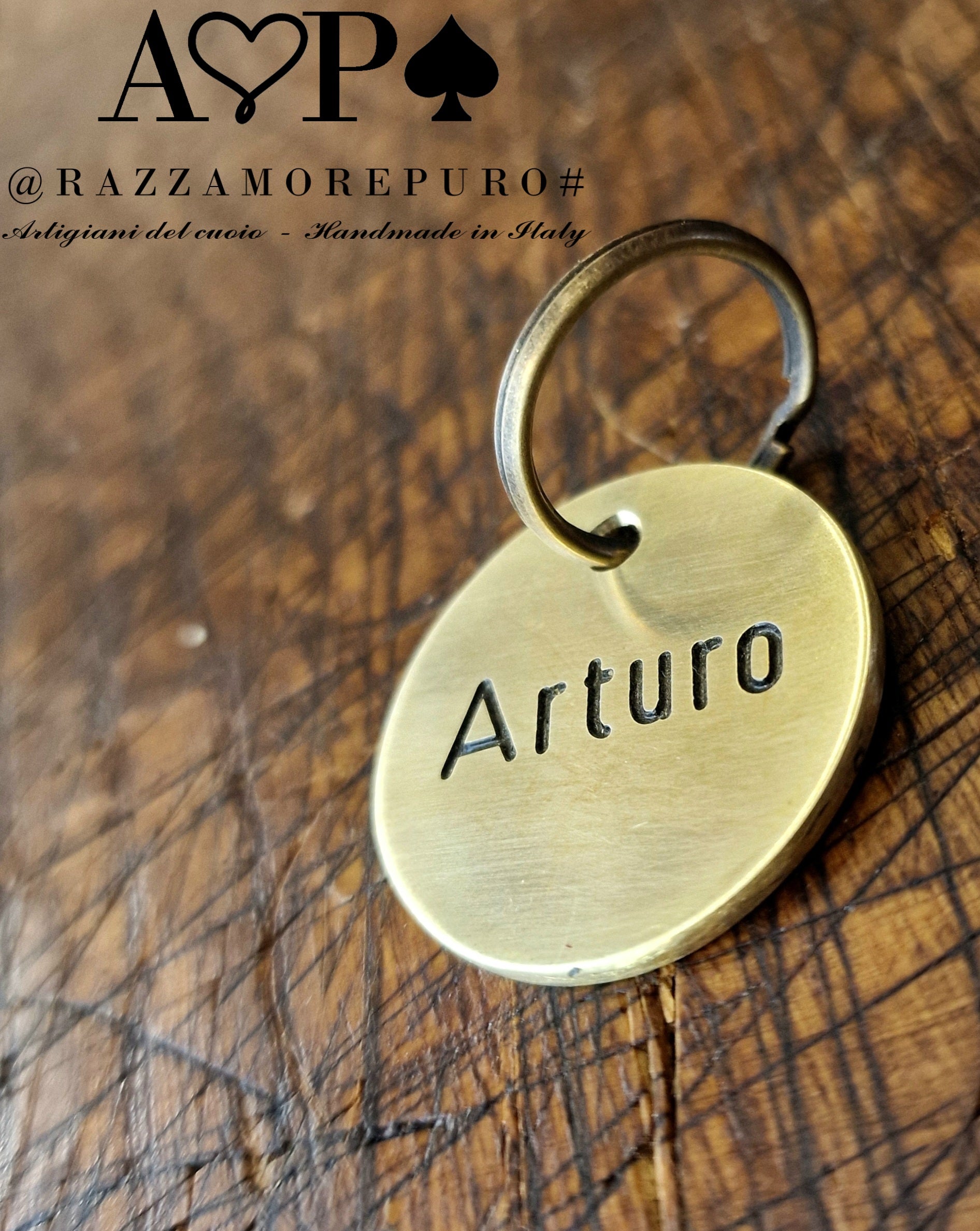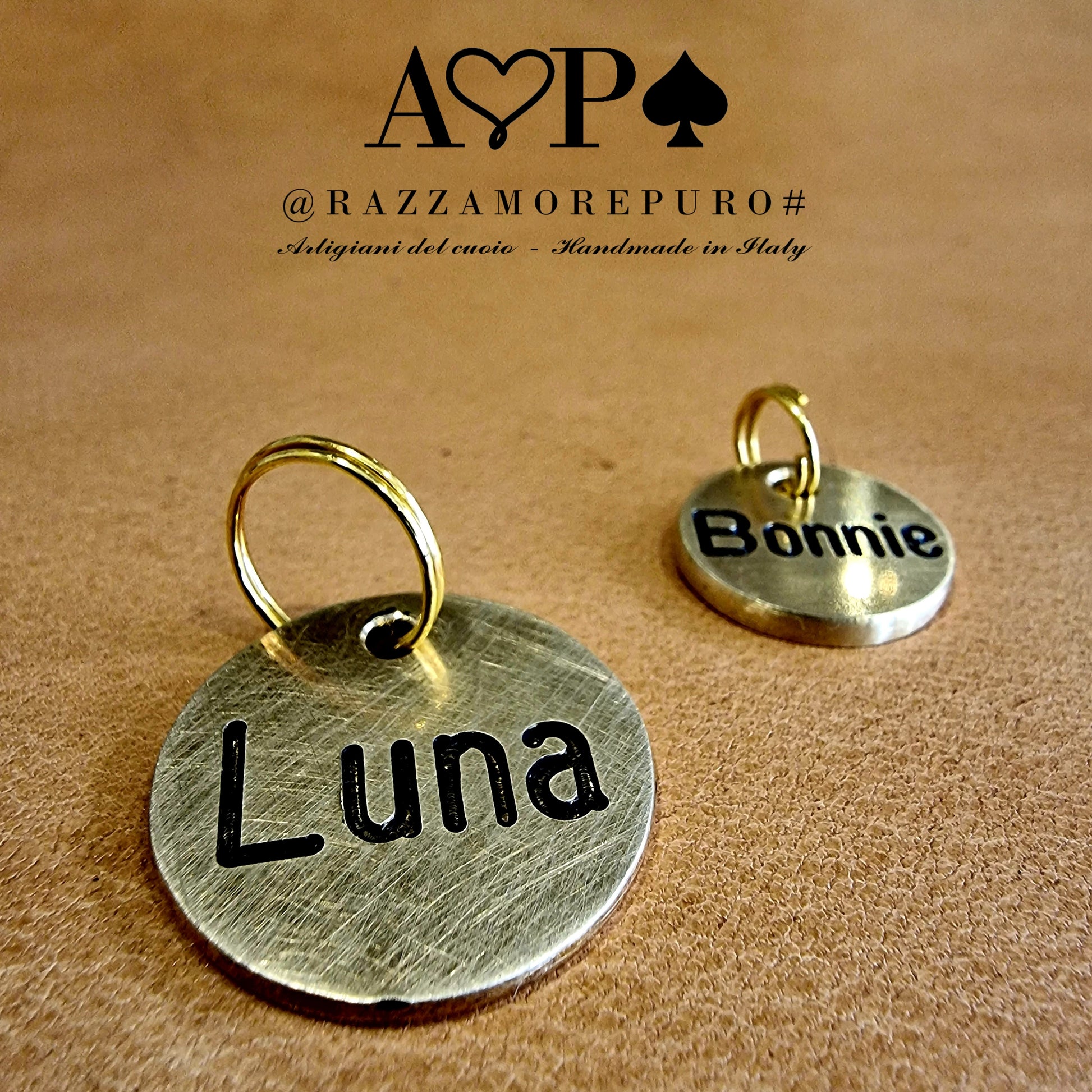 Étiquette d'identification en laiton véritable fabriquée à la main, comprenant un anneau en spirale pour l'attacher au collier.
