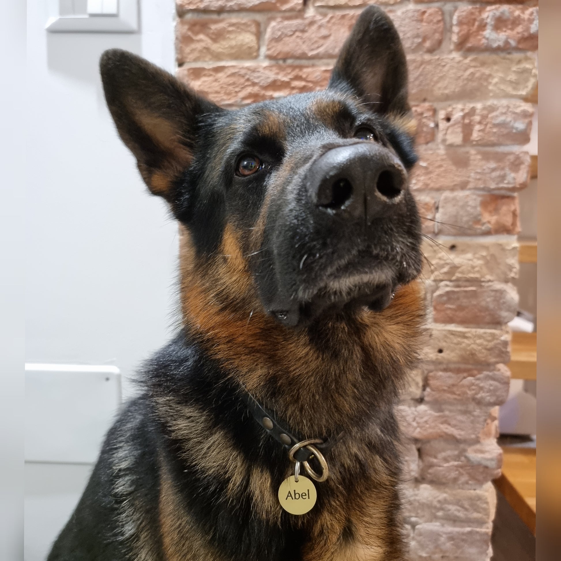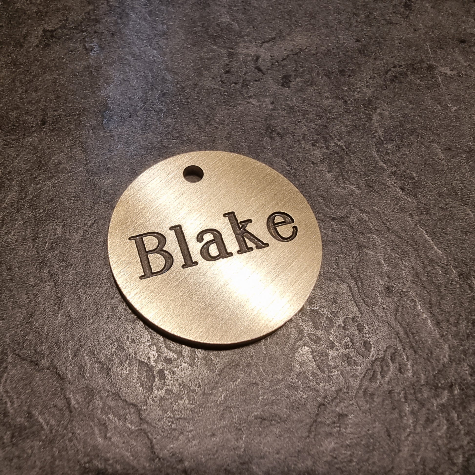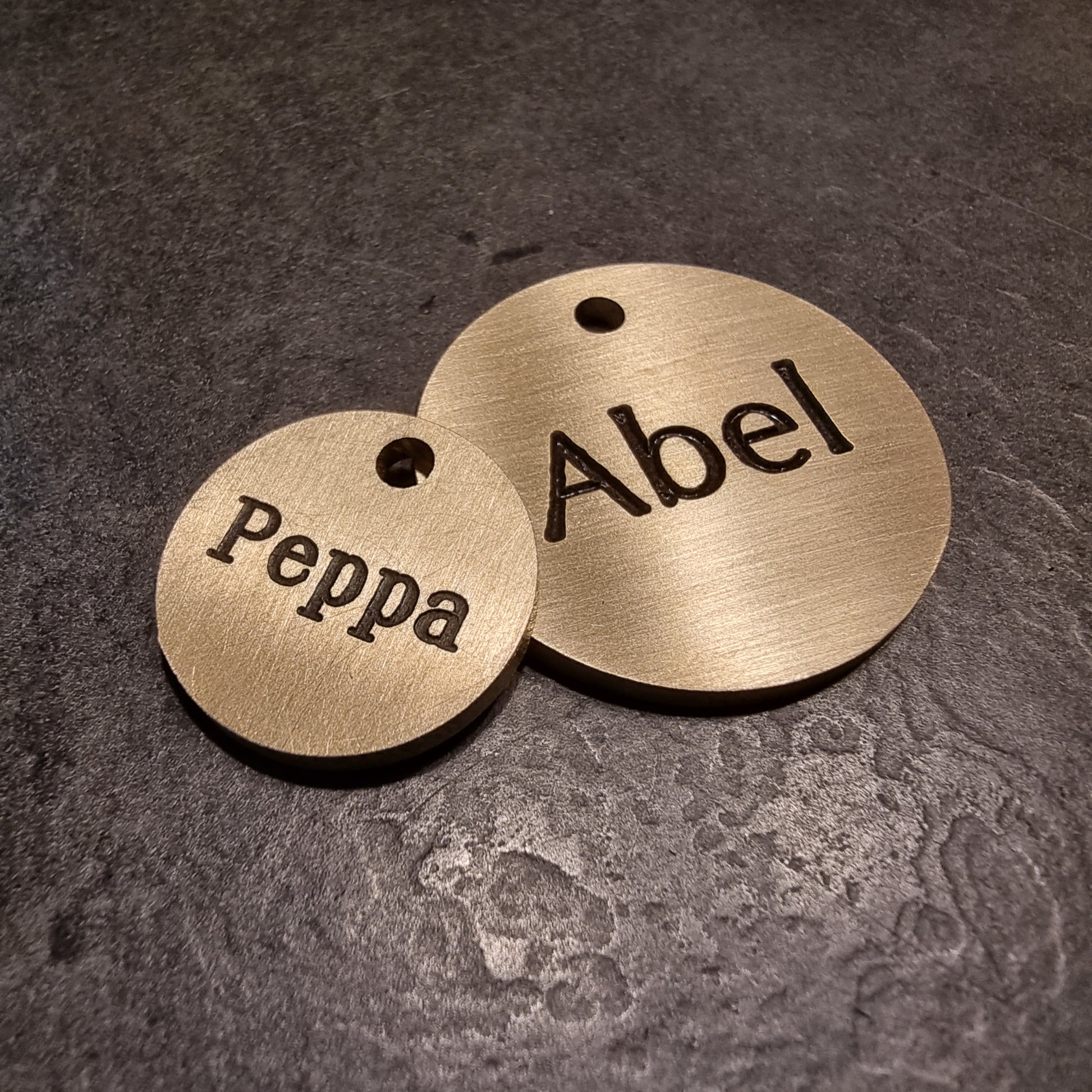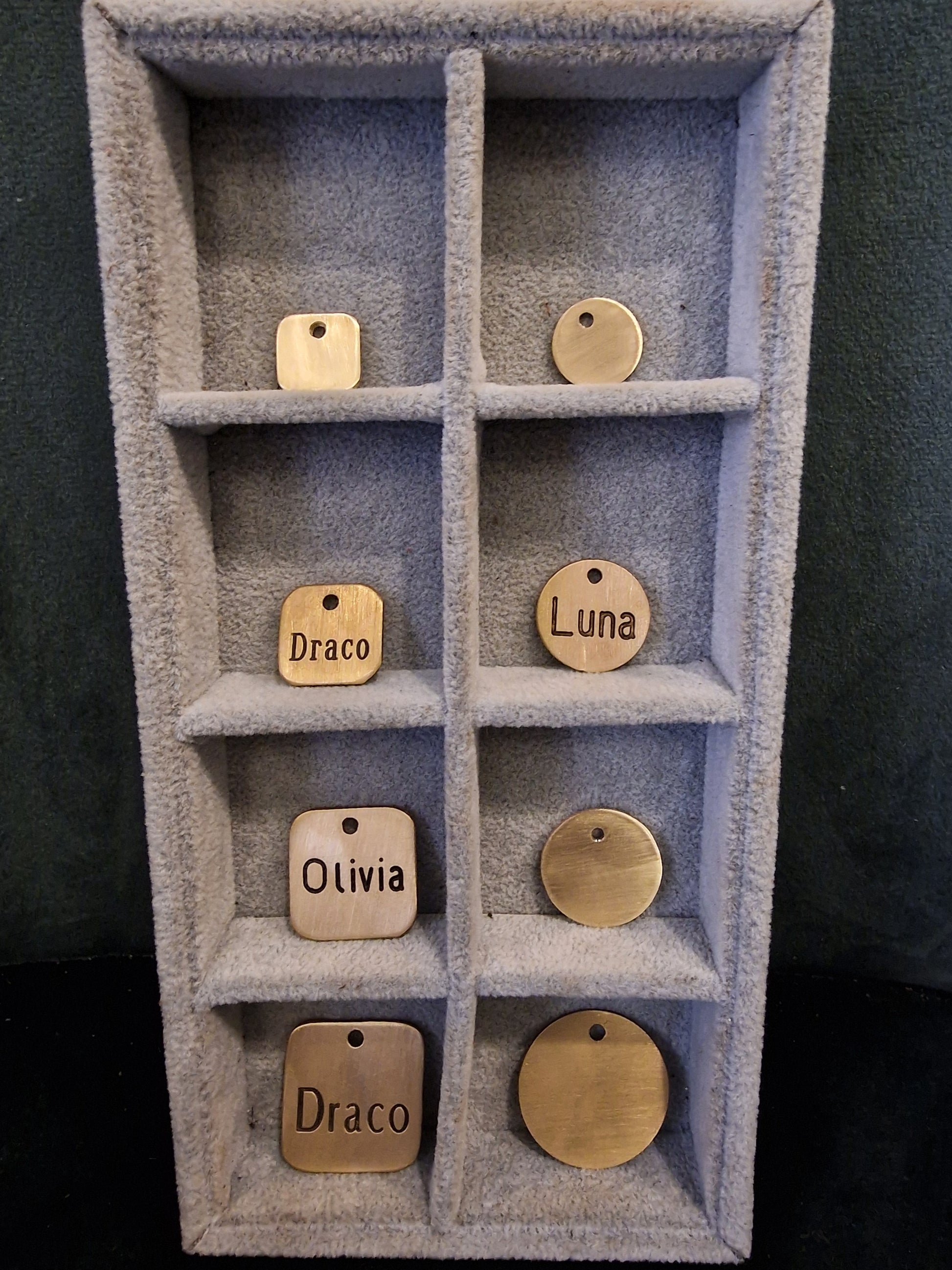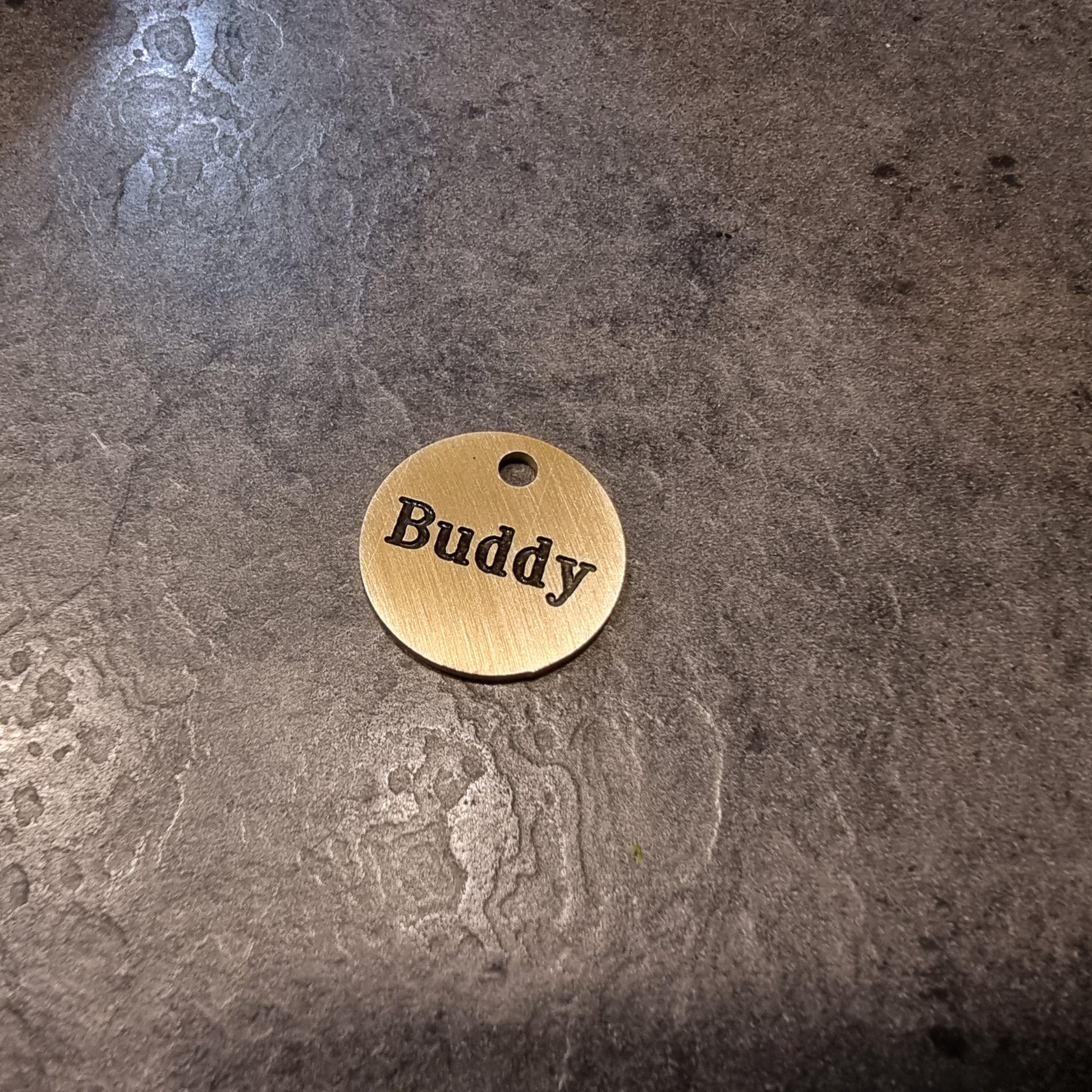 Étiquette d'identification en laiton véritable fabriquée à la main, comprenant un anneau en spirale pour l'attacher au collier.