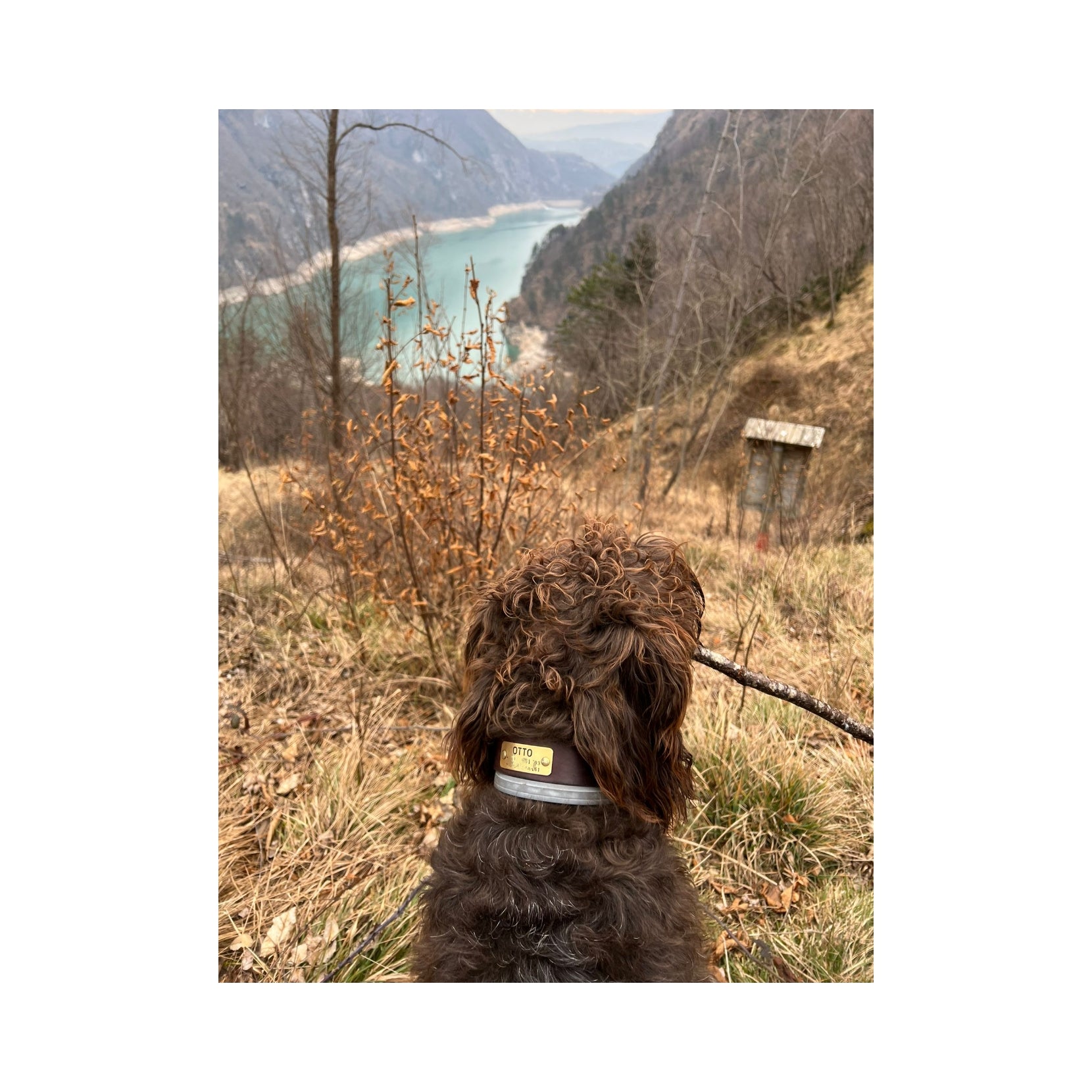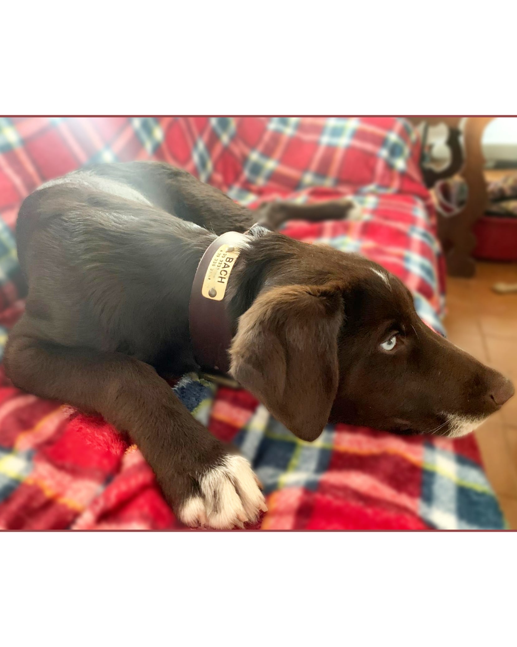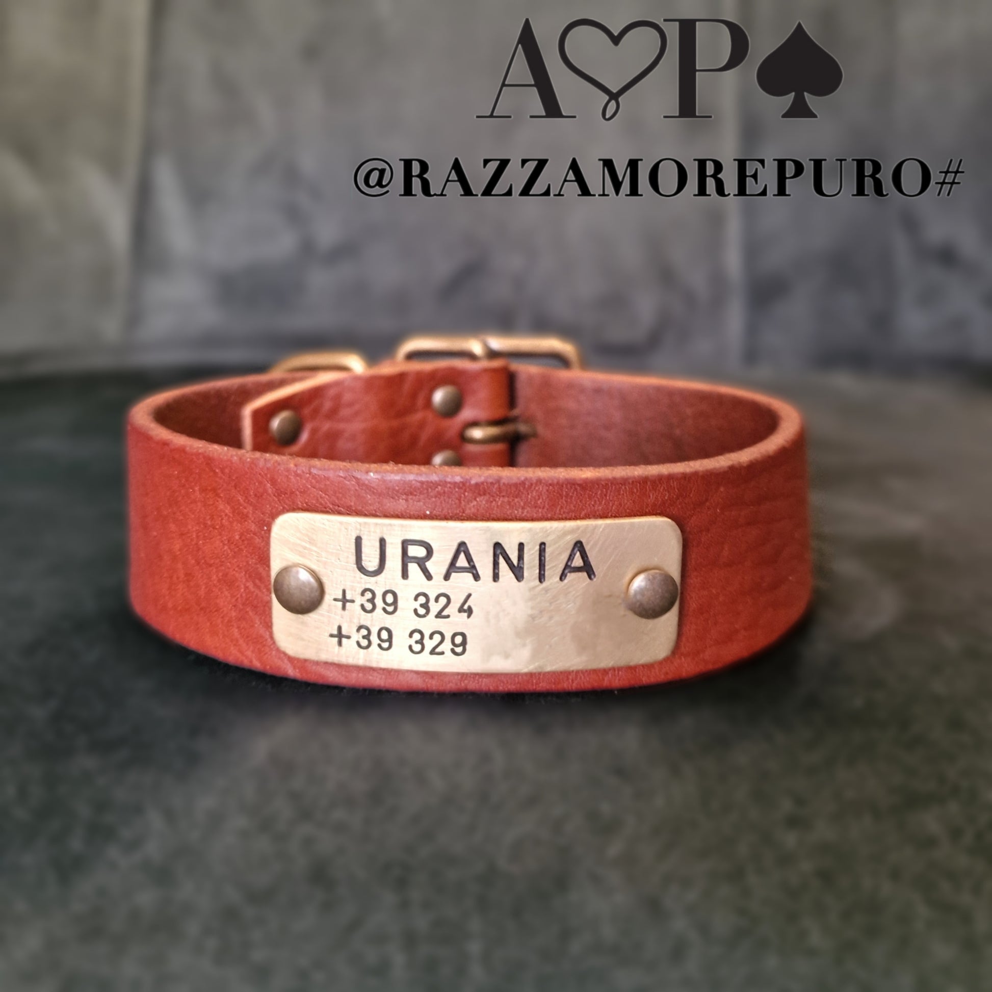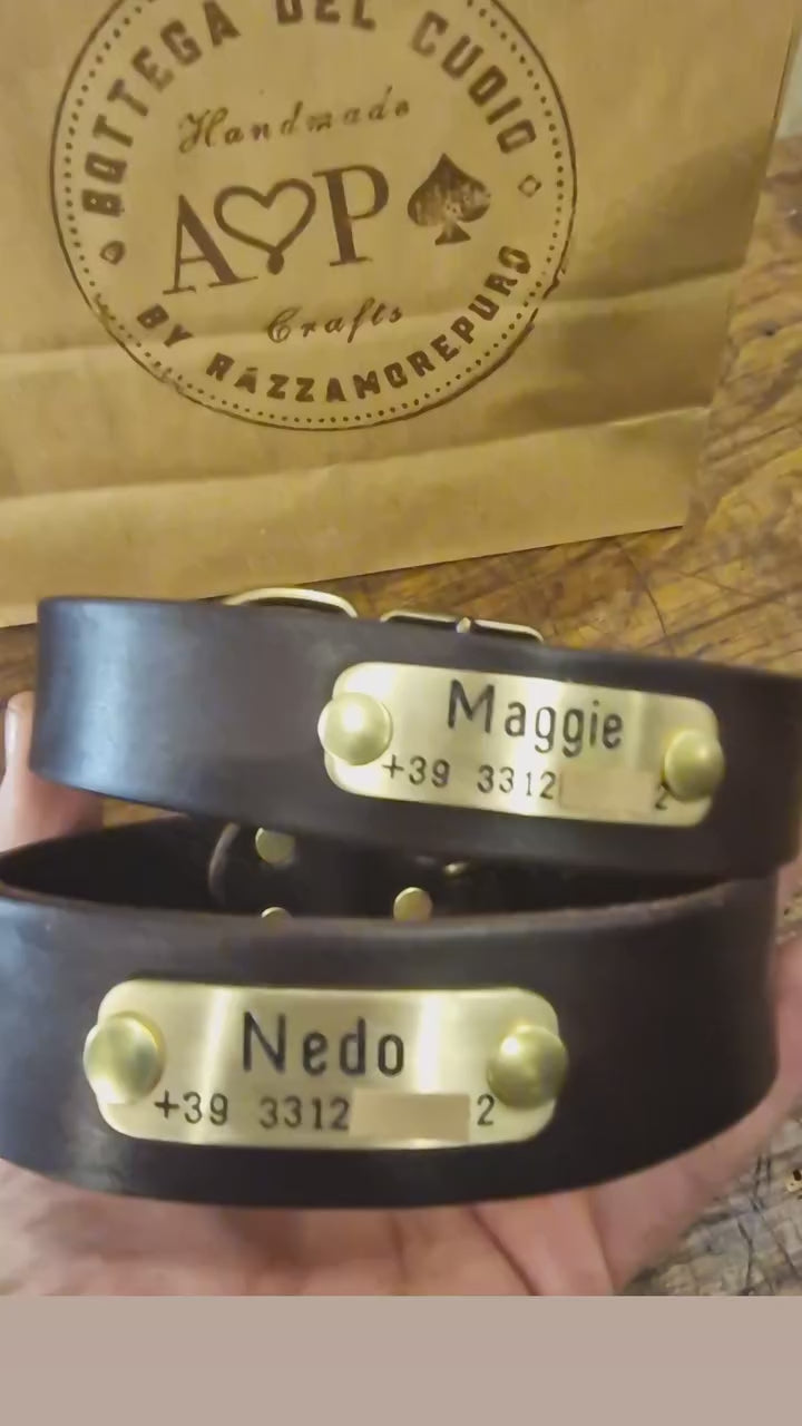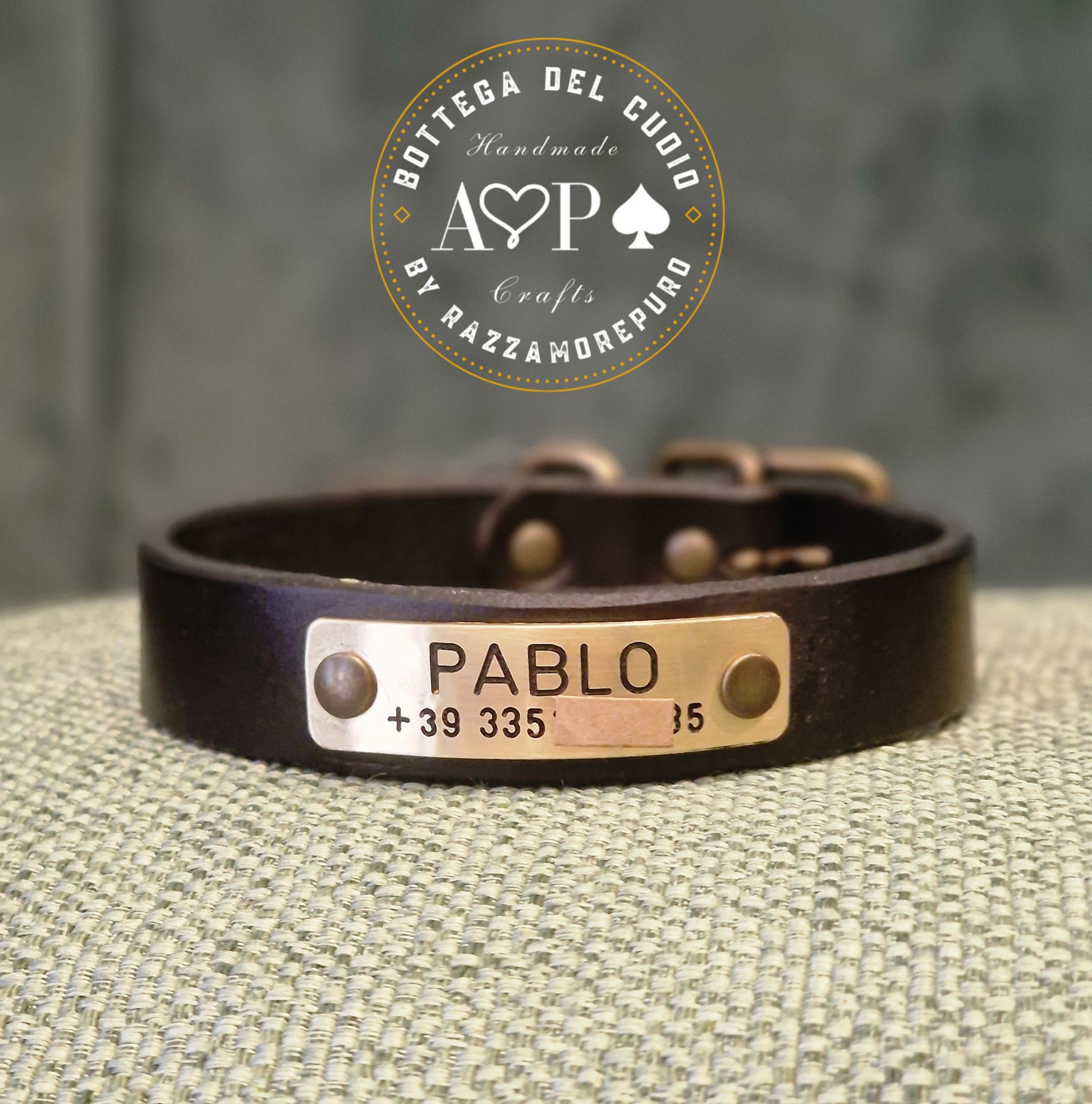 Collare a fibbia in cuoio con medaglietta di riconoscimento con nome e numero di telefono inciso