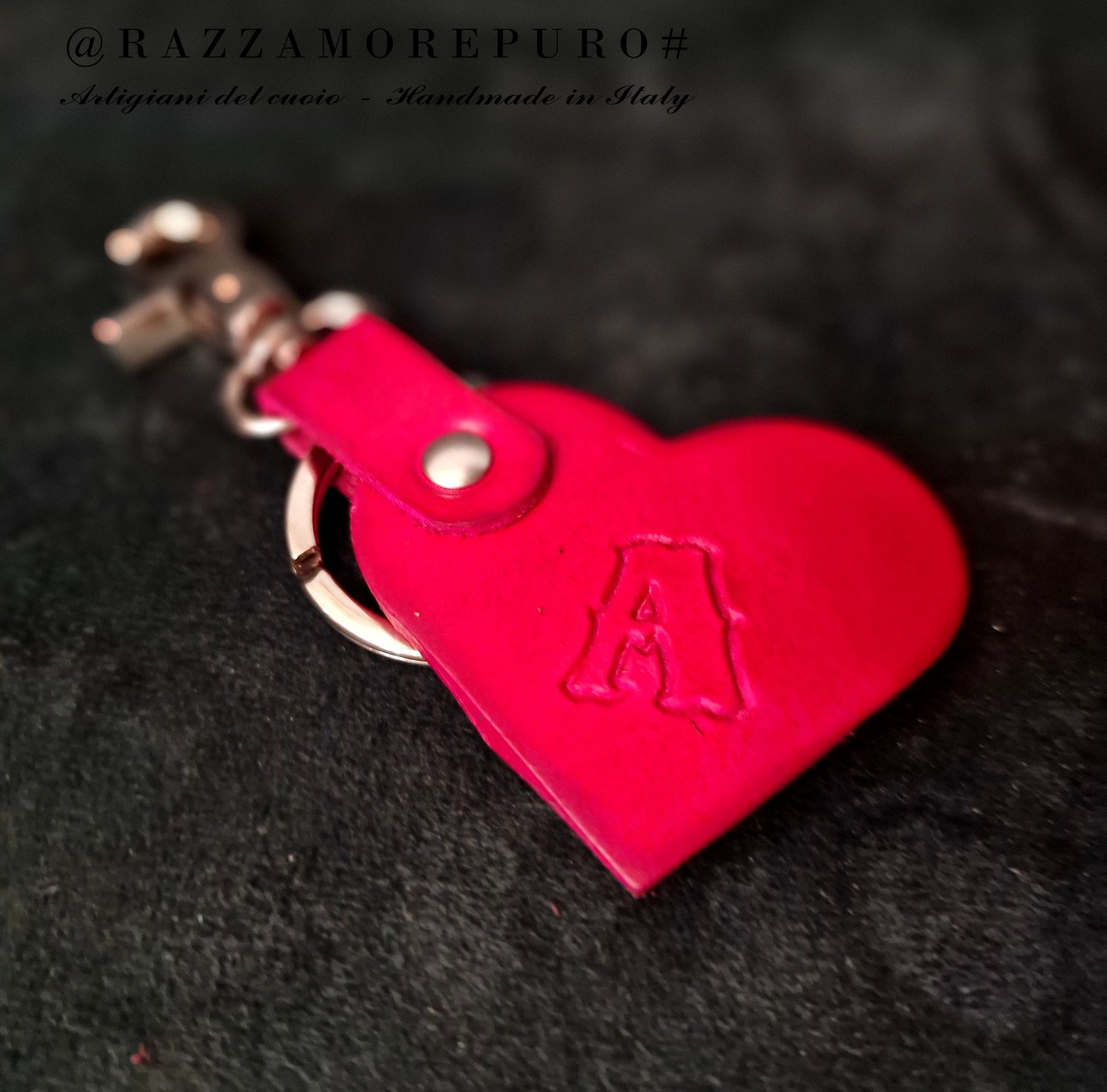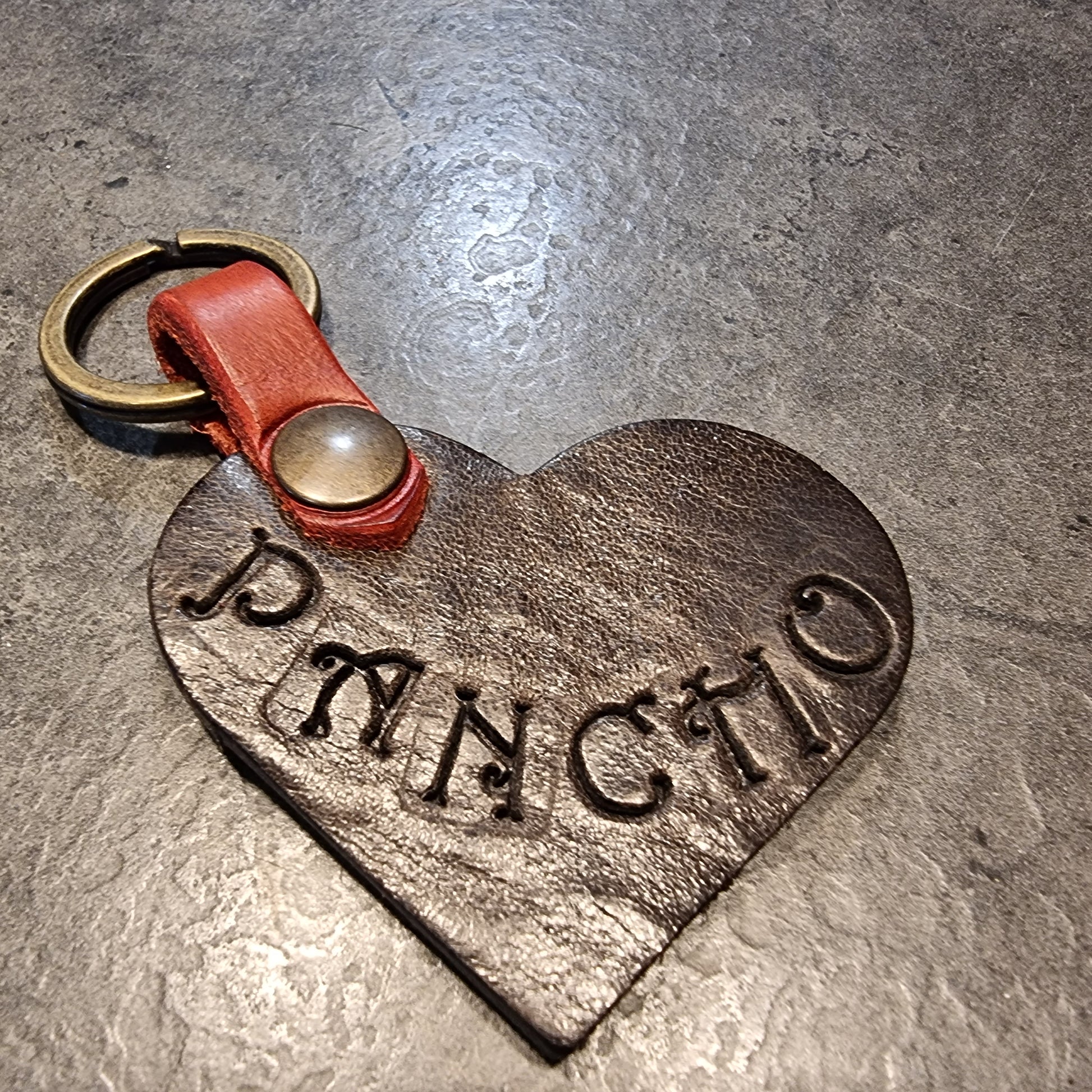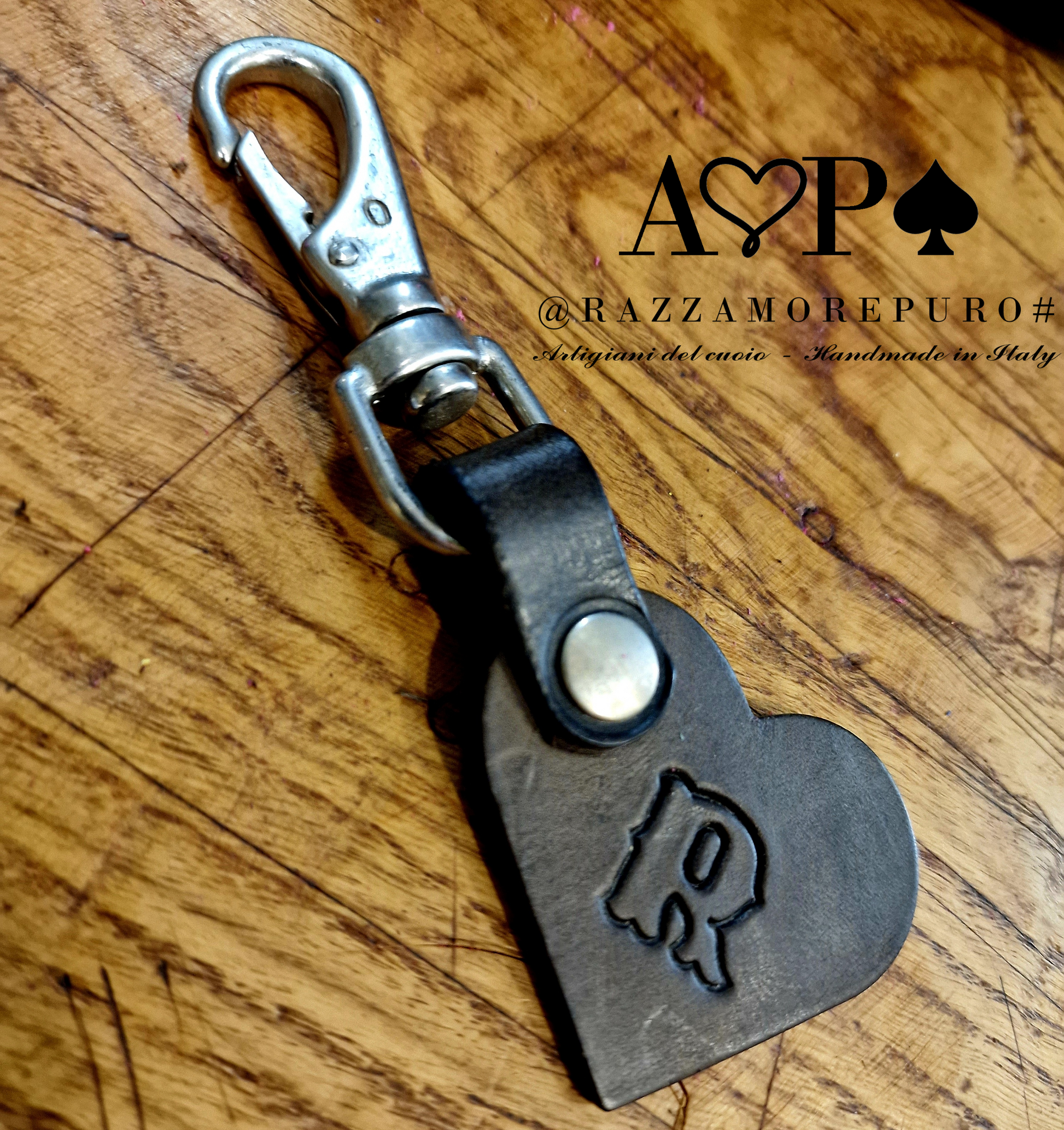 Portachiavi in cuoio con moschettone ed anello. personalizzabile con una parola di max 8 caratteri o 1/2 iniziali grandi