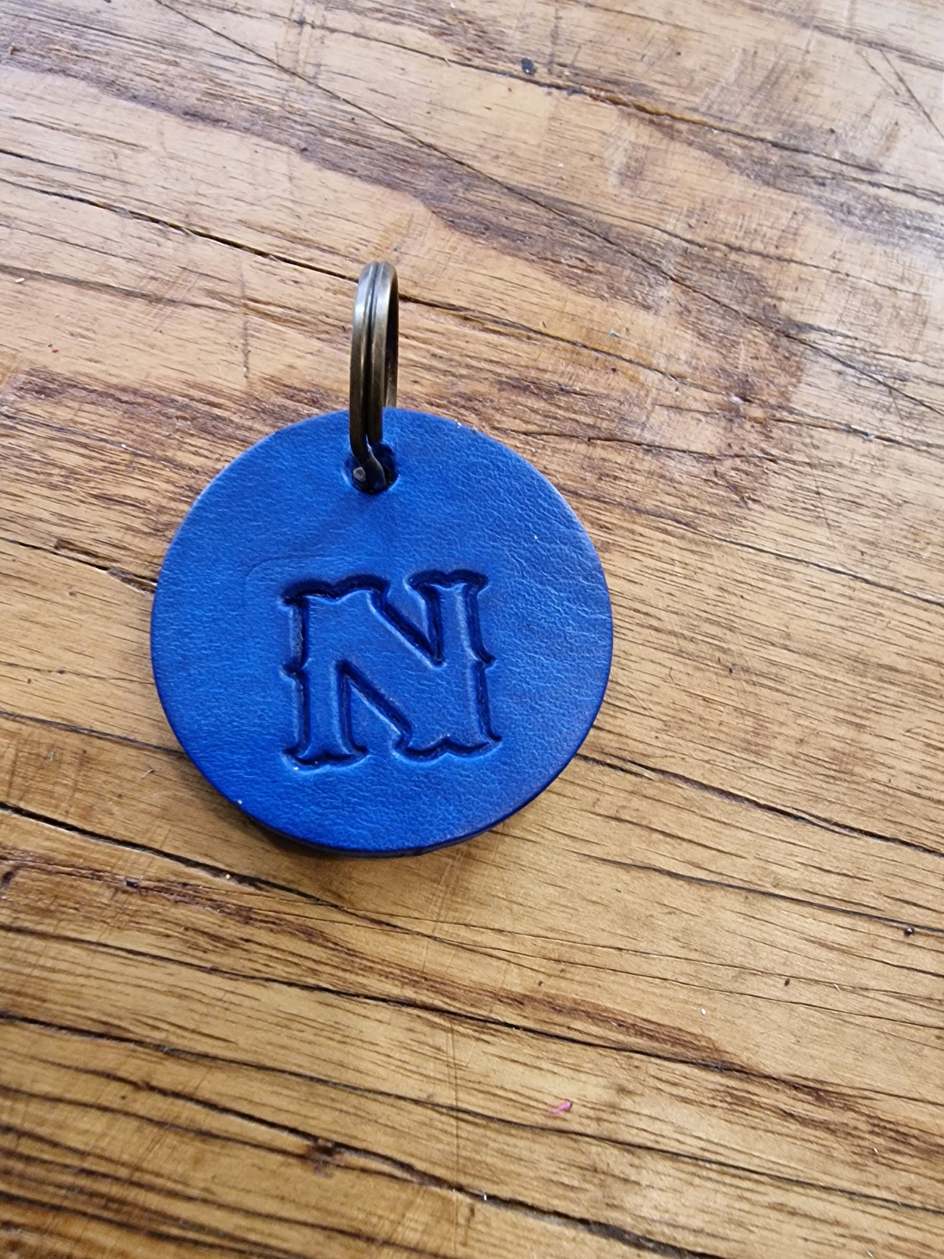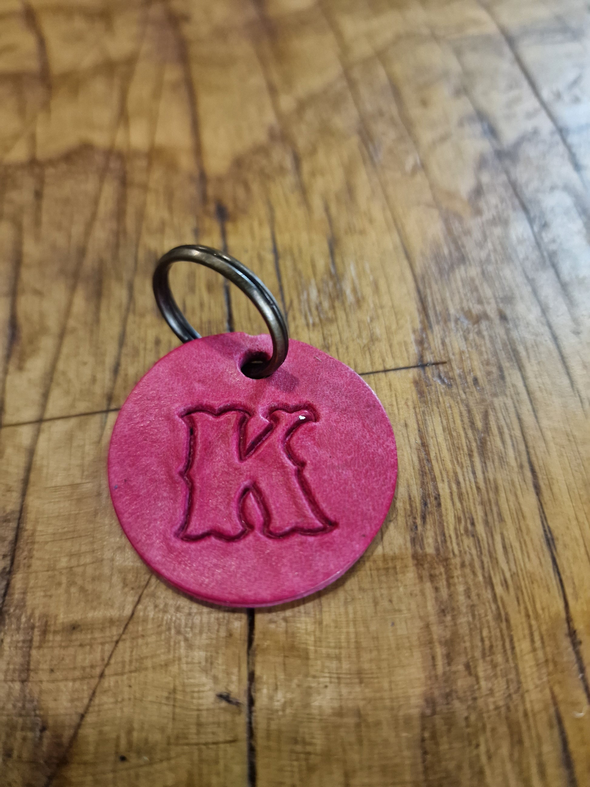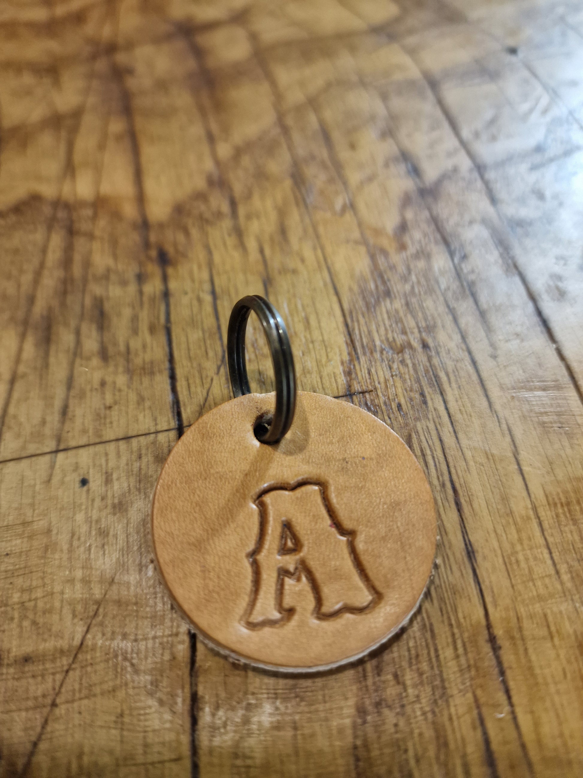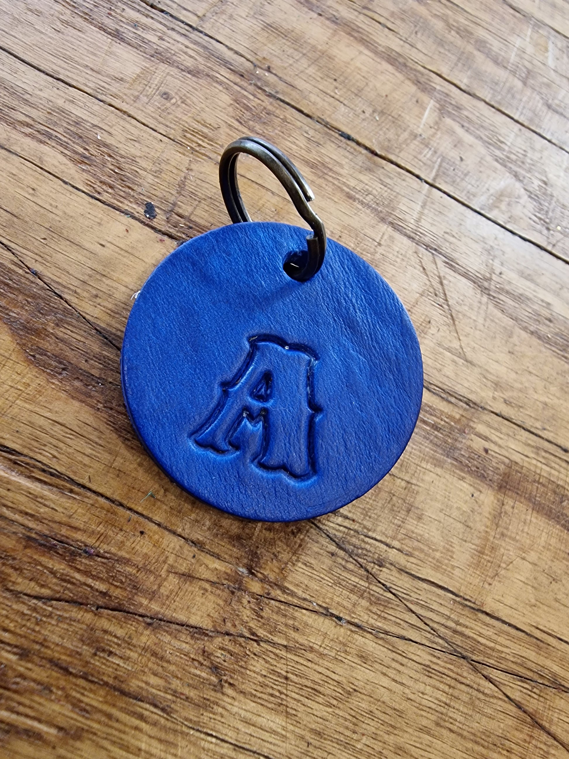 Portachiavi rotondo(diametro circa 2,5cm) in cuoio con una lettera incisa come in foto