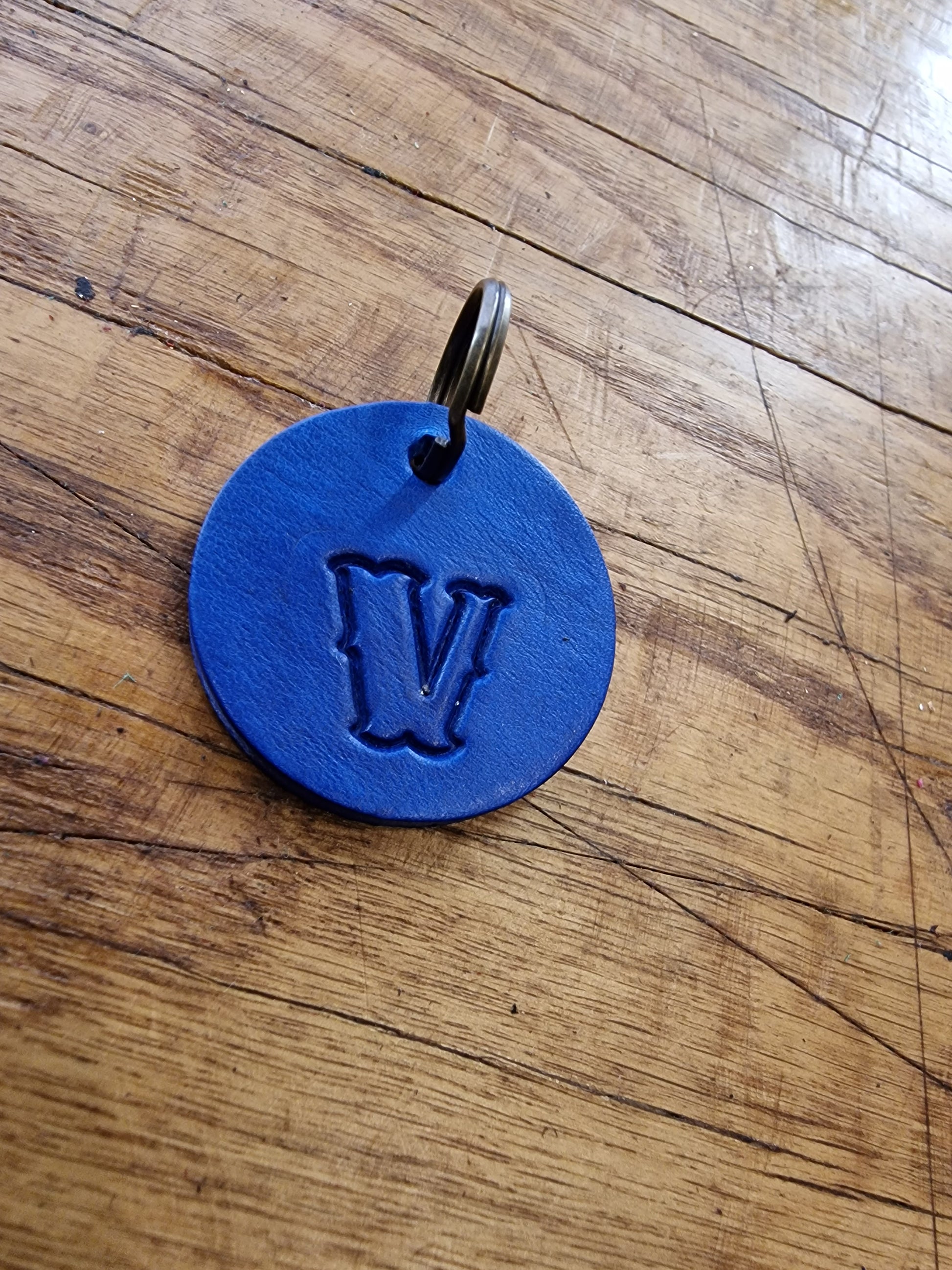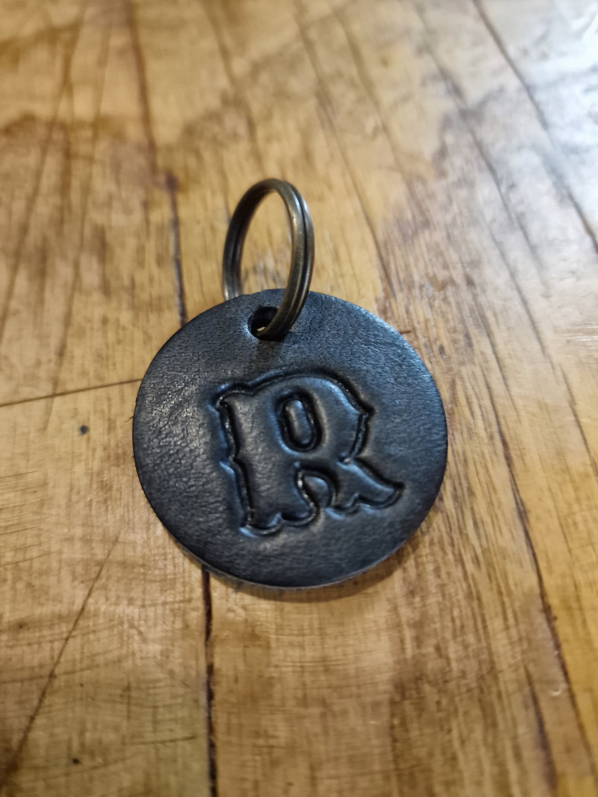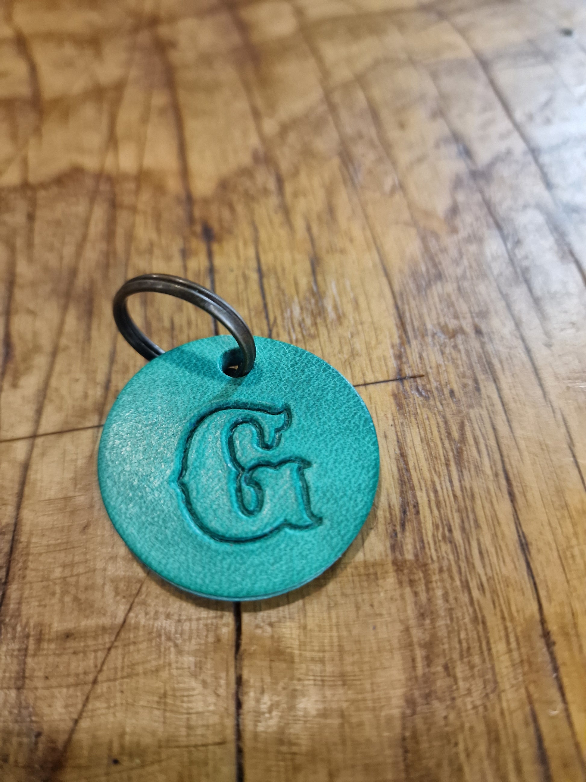 Portachiavi rotondo(diametro circa 2,5cm) in cuoio con una lettera incisa come in foto