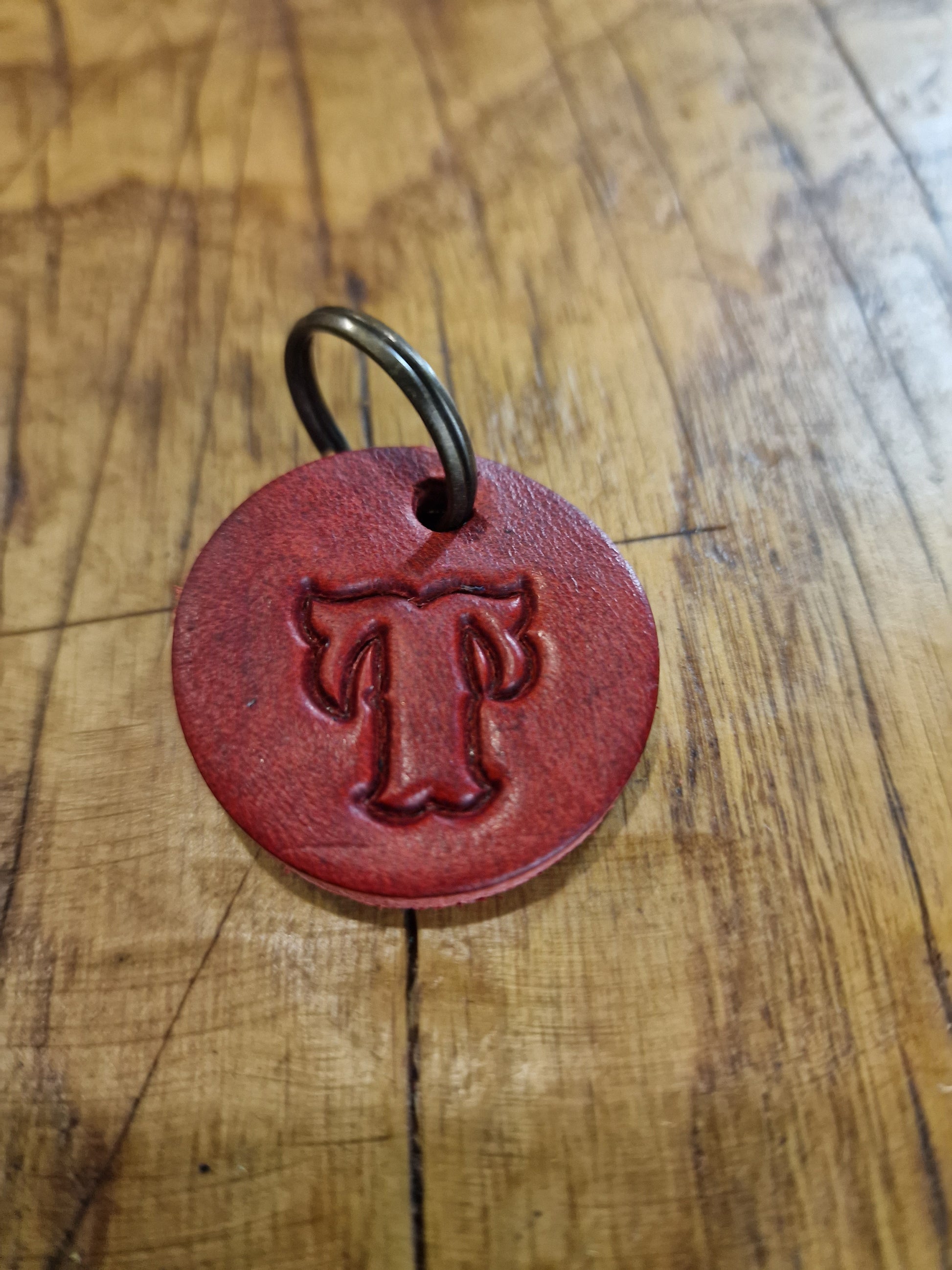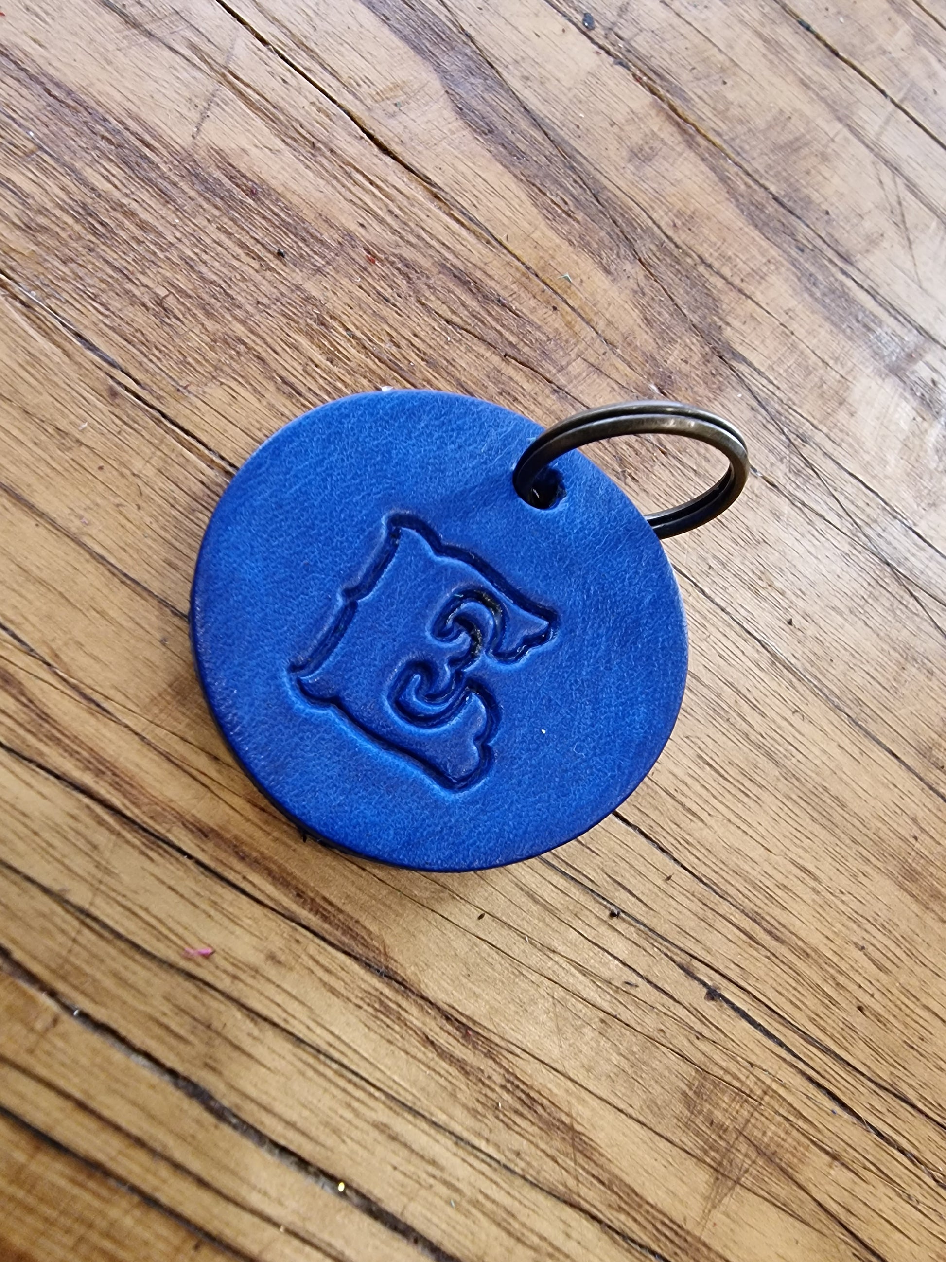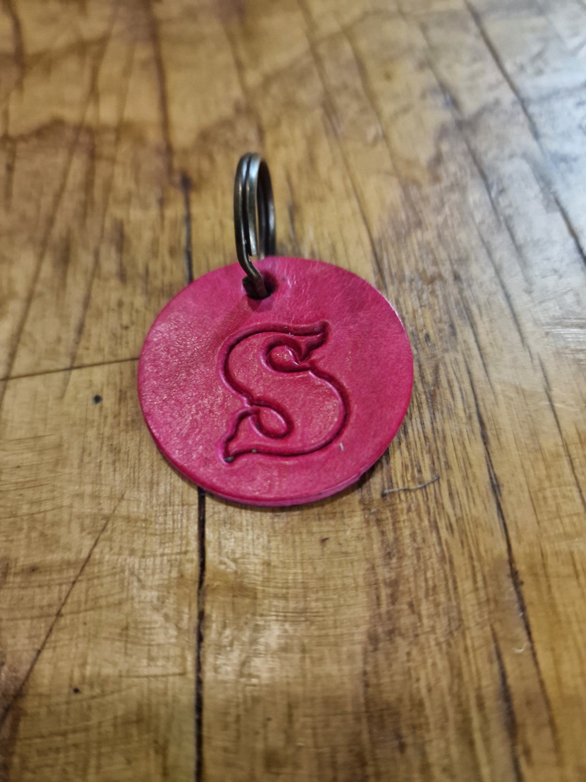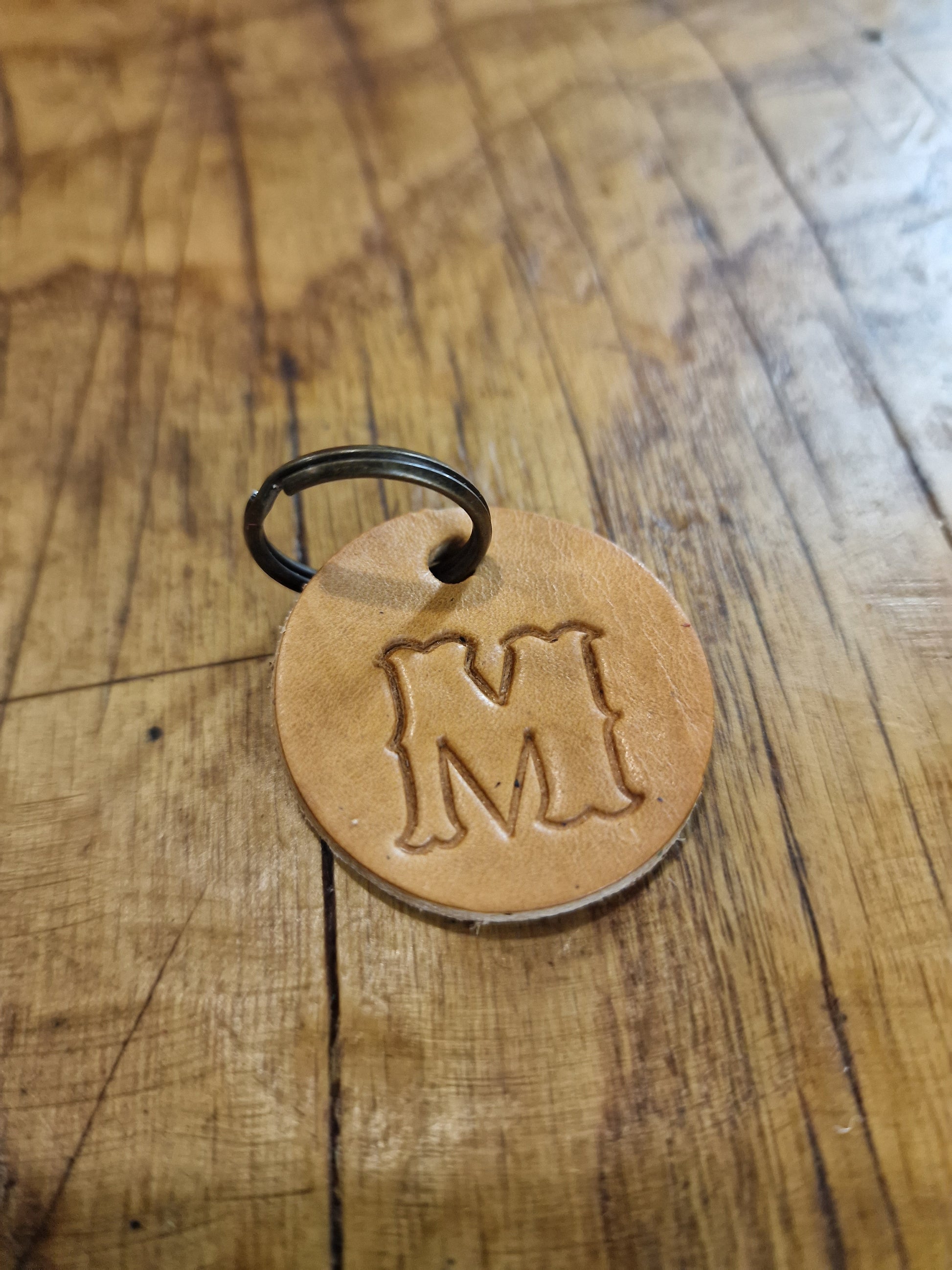 Portachiavi rotondo(diametro circa 2,5cm) in cuoio con una lettera incisa come in foto